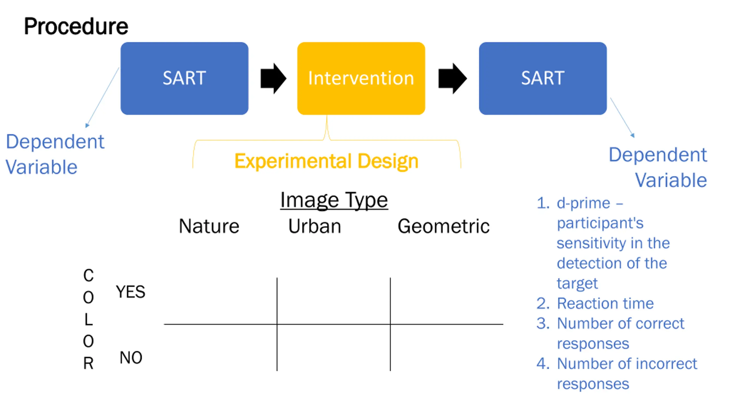 Procedure Procedure SART Intervention SART Dependent Variable Dependent Variable Experimental Design Experimental Design Image Type Urban 1. d-prime participant's sensitivity in the detection of the target 2. Reaction time 3. Number of correct responses 4. Number of incorrect responses Nature Geometric C O L O R YES NO