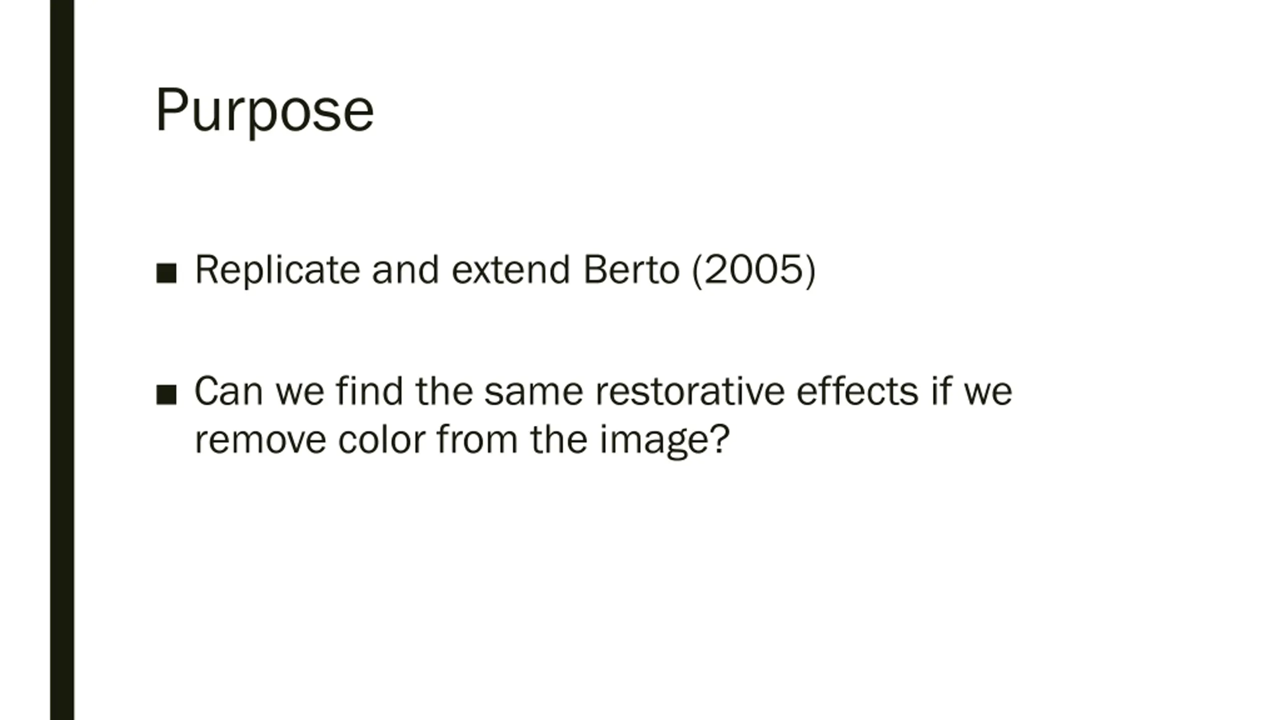 Purpose Replicate and extend Berto (2005) Can we find the same restorative effects if we remove color from the image?