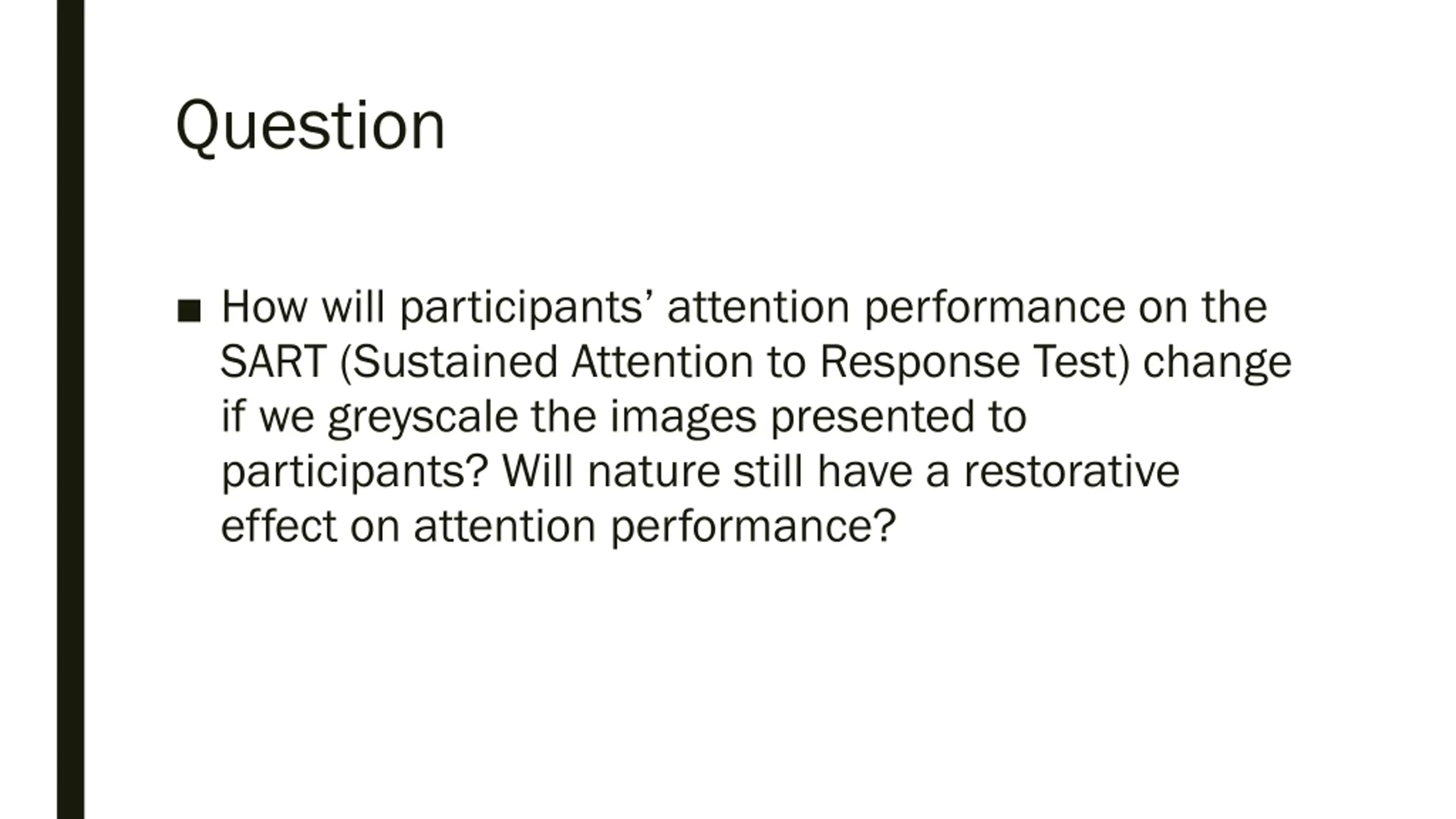 Question How will participants attention performance on the SART (Sustained Attention to Response Test) change if we greyscale the images presented to participants? Will nature still have a restorative effect on attention performance?