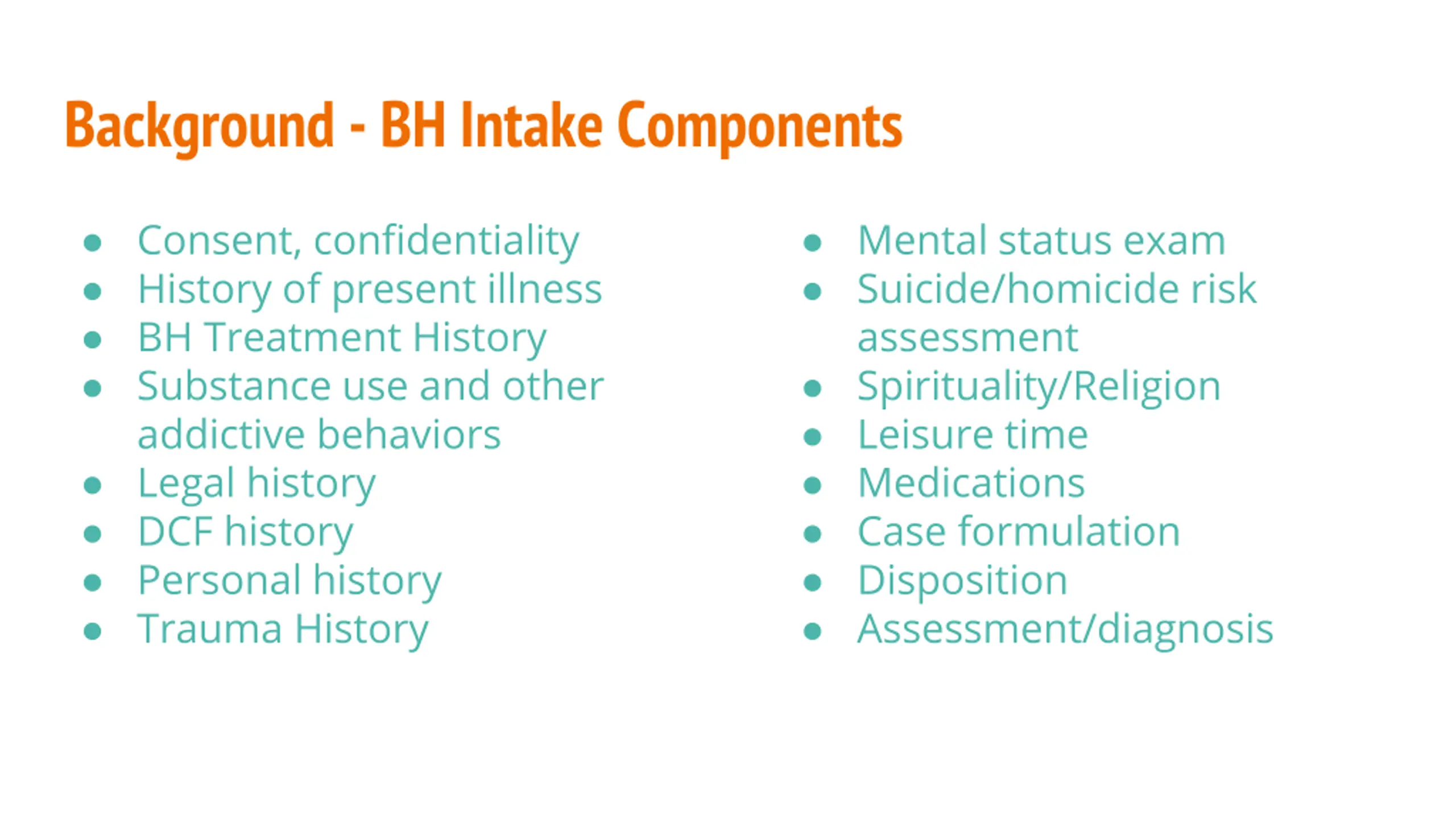 Background - BH Intake Components Consent, confidentiality History of present illness BH Treatment History Substance use and other addictive behaviors Legal history DCF history Personal history Trauma History Mental status exam Suicide/homicide risk assessment Spirituality/Religion Leisure time Medications Case formulation Disposition Assessment/diagnosis