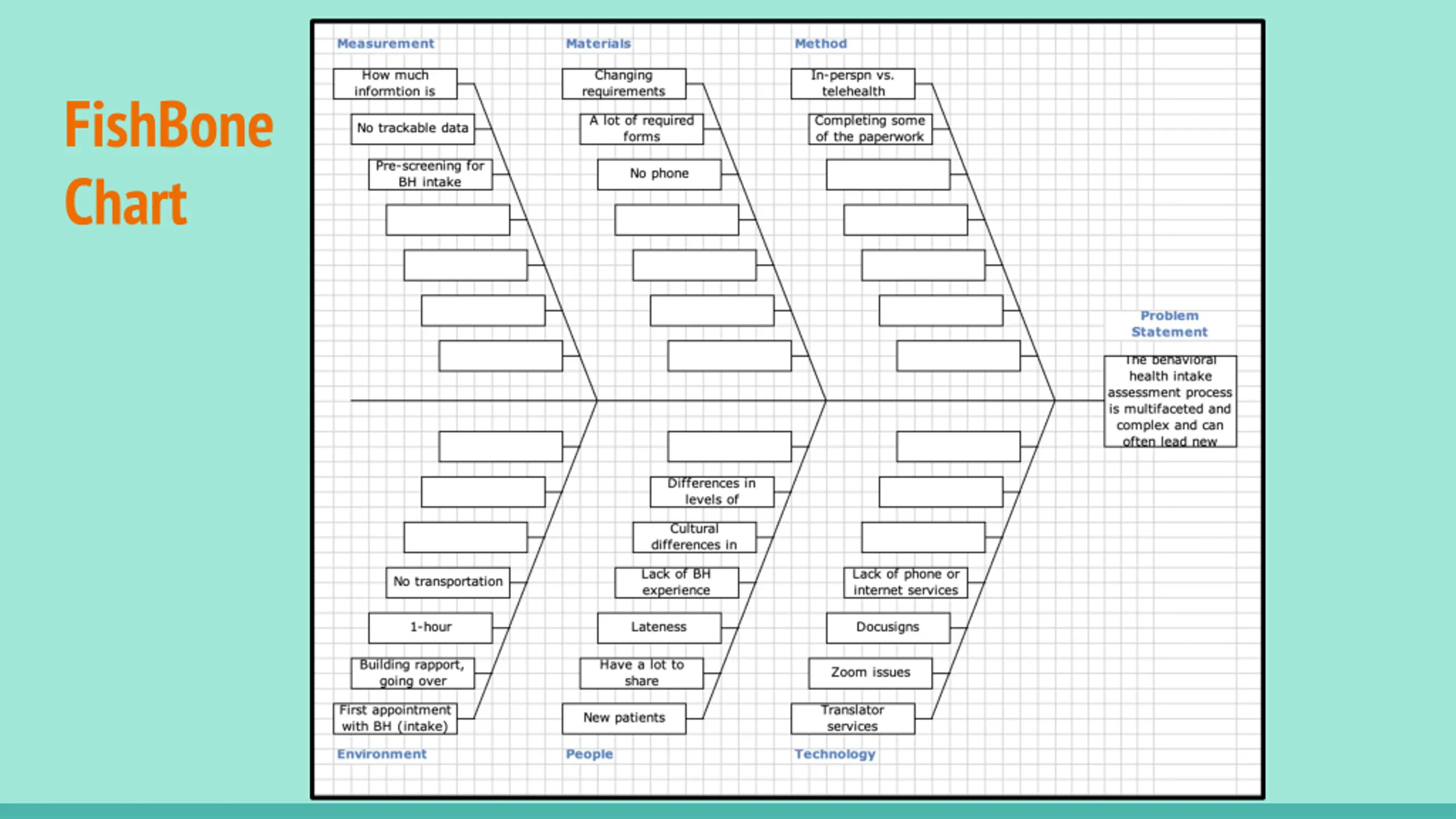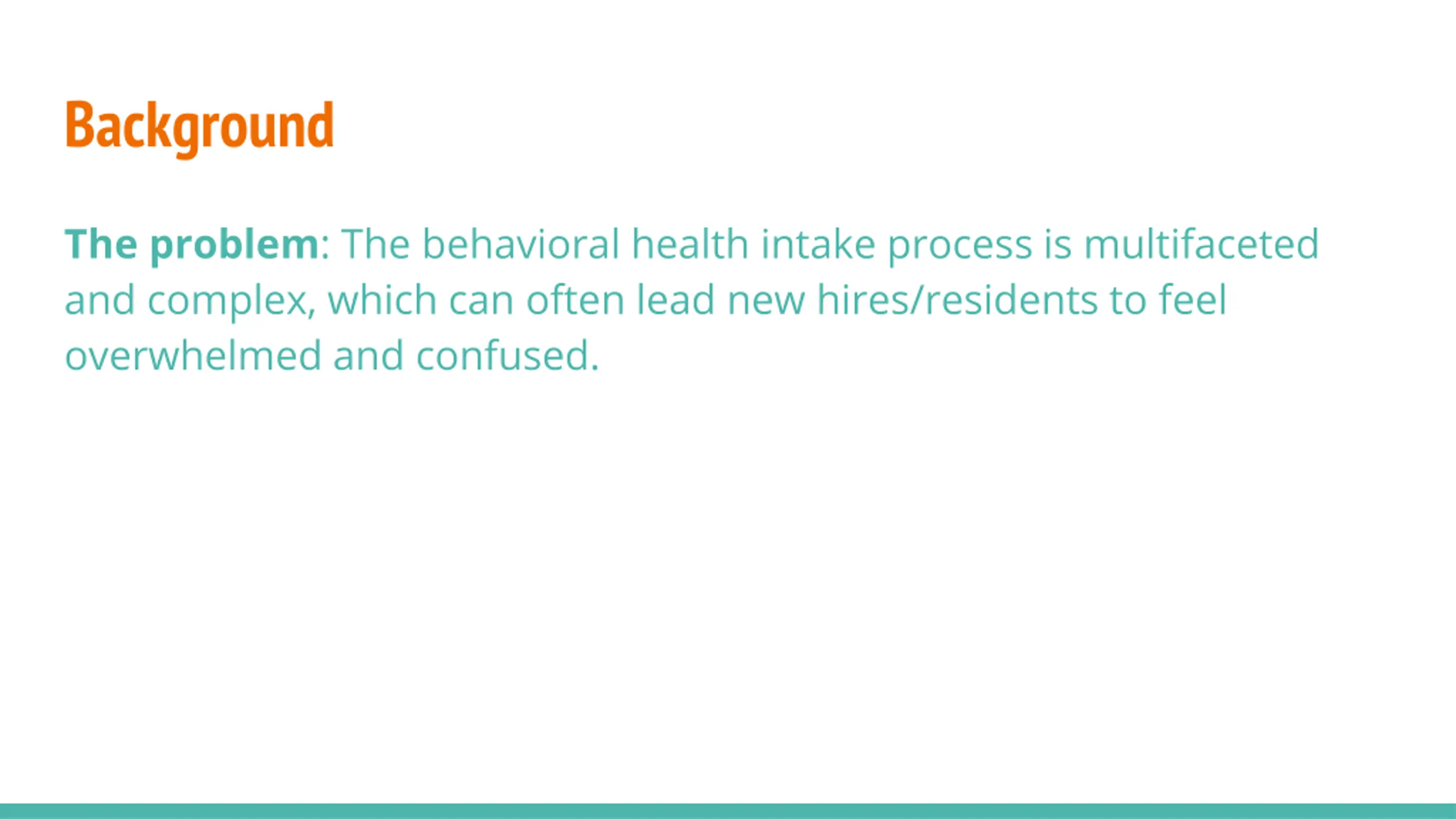 Background The problem: The behavioral health intake process is multifaceted and complex, which can often lead new hires/residents to feel overwhelmed and confused.