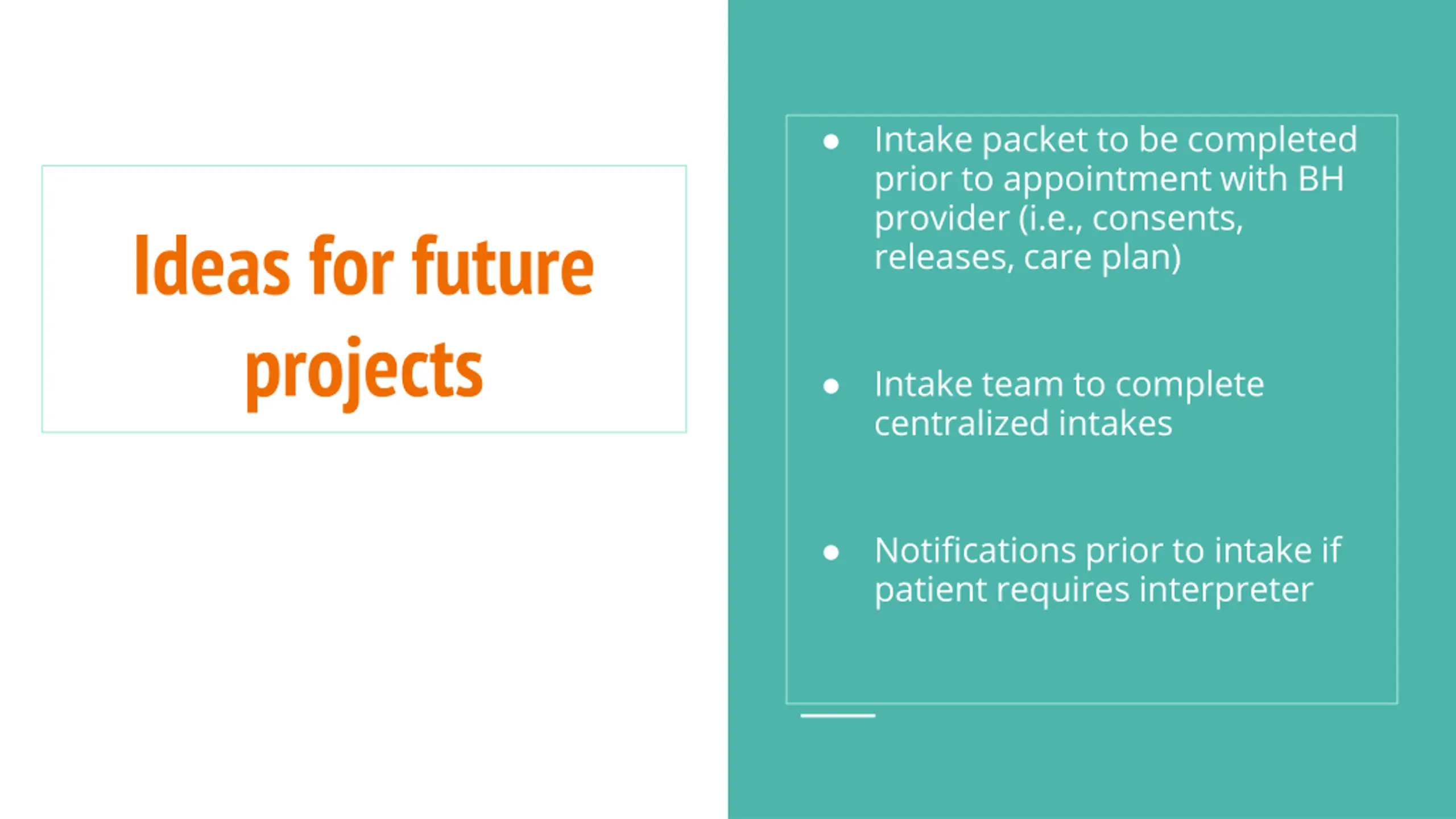 Intake packet to be completed prior to appointment with BH provider (i.e., consents, releases, care plan) Ideas for future projects Intake team to complete centralized intakes Notifications prior to intake if patient requires interpreter