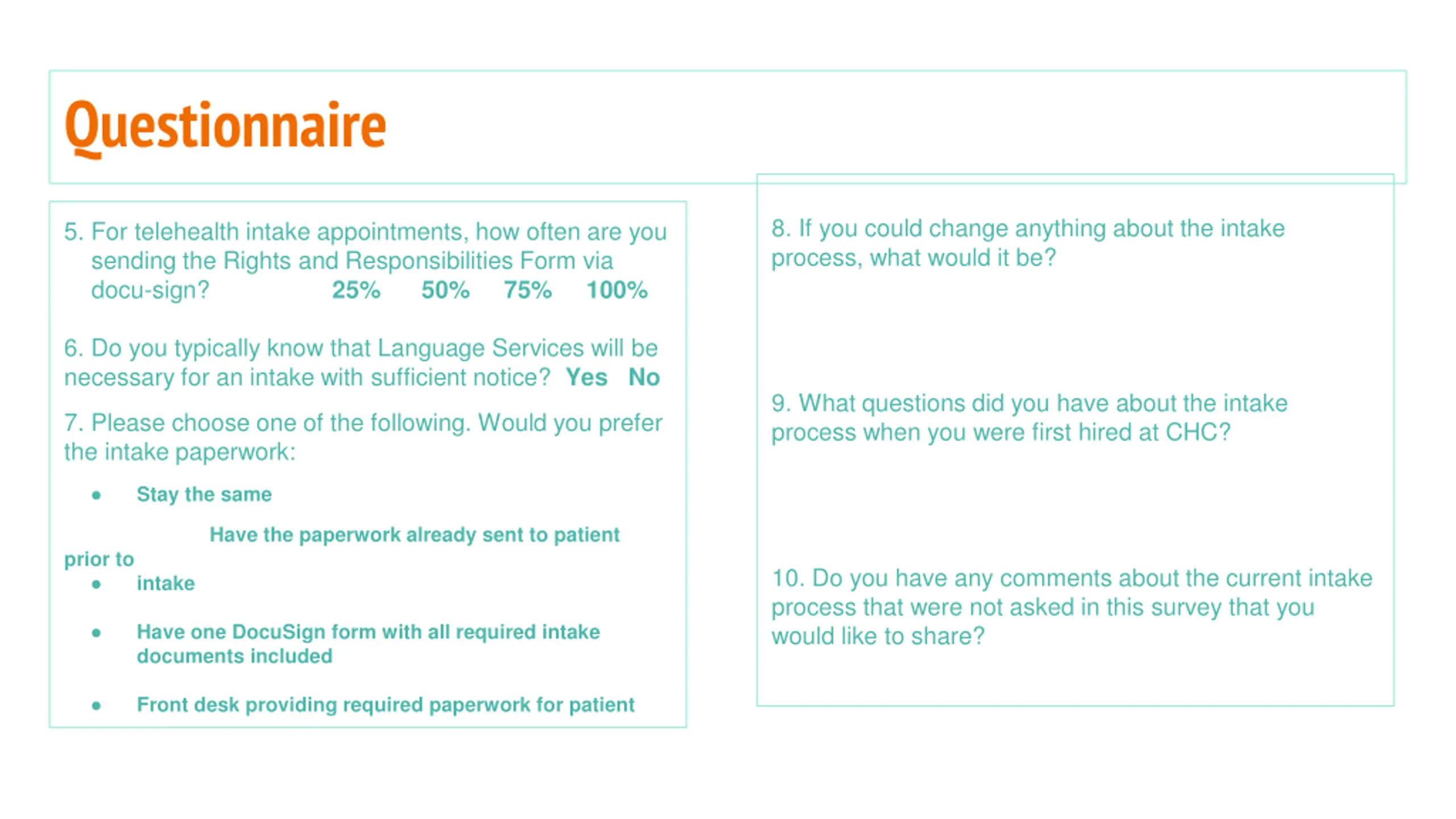 Questionnaire 8. If you could change anything about the intake process, what would it be? 5. For telehealth intake appointments, how often are you sending the Rights and Responsibilities Form via docu-sign? 25% 50% 75% 100% 6. Do you typically know that Language Services will be necessary for an intake with sufficient notice? Yes No 9. What questions did you have about the intake process when you were first hired at CHC? 7. Please choose one of the following. Would you prefer the intake paperwork: Stay the same Have the paperwork already sent to patient prior to 10. Do you have any comments about the current intake process that were not asked in this survey that you would like to share? intake Have one DocuSign form with all required intake documents included Front desk providing required paperwork for patient