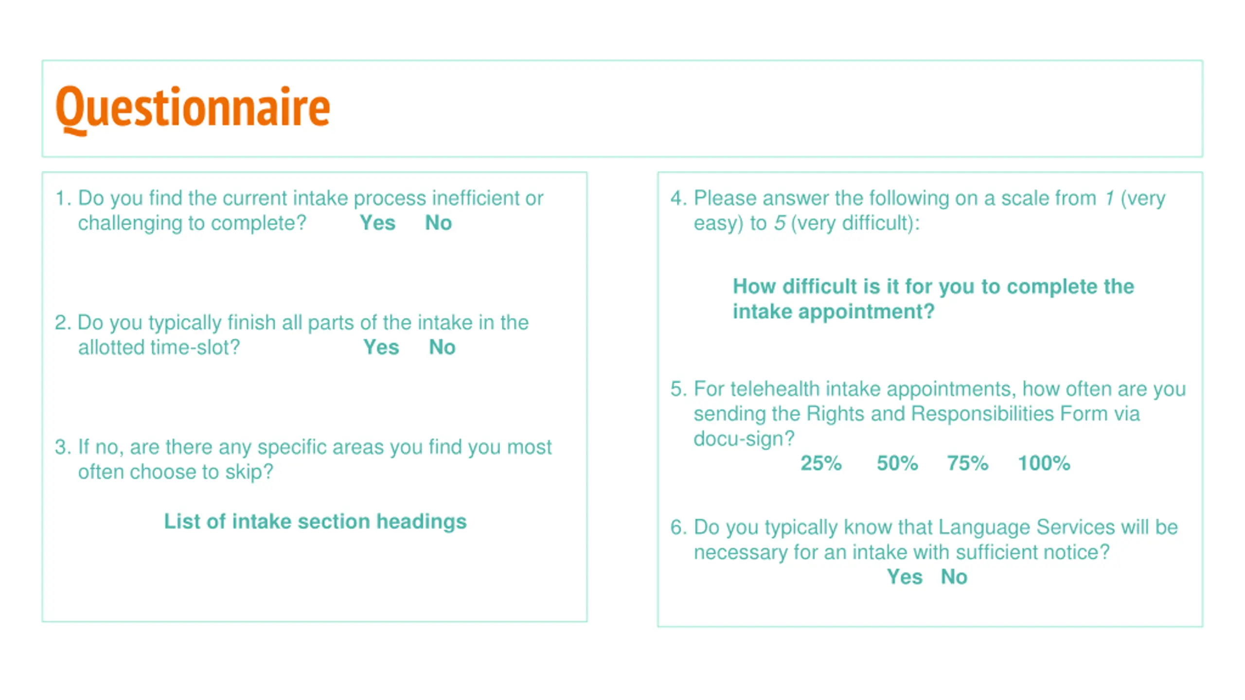 Questionnaire 1. Do you find the current intake process inefficient or challenging to complete? Yes No 4. Please answer the following on a scale from 1 (very easy) to 5 (very difficult): How difficult is it for you to complete the intake appointment? 2. Do you typically finish all parts of the intake in the allotted time-slot? Yes No 5. For telehealth intake appointments, how often are you sending the Rights and Responsibilities Form via docu-sign? 25% 50% 75% 100% 3. If no, are there any specific areas you find you most often choose to skip? List of intake section headings 6. Do you typically know that Language Services will be necessary for an intake with sufficient notice? Yes No