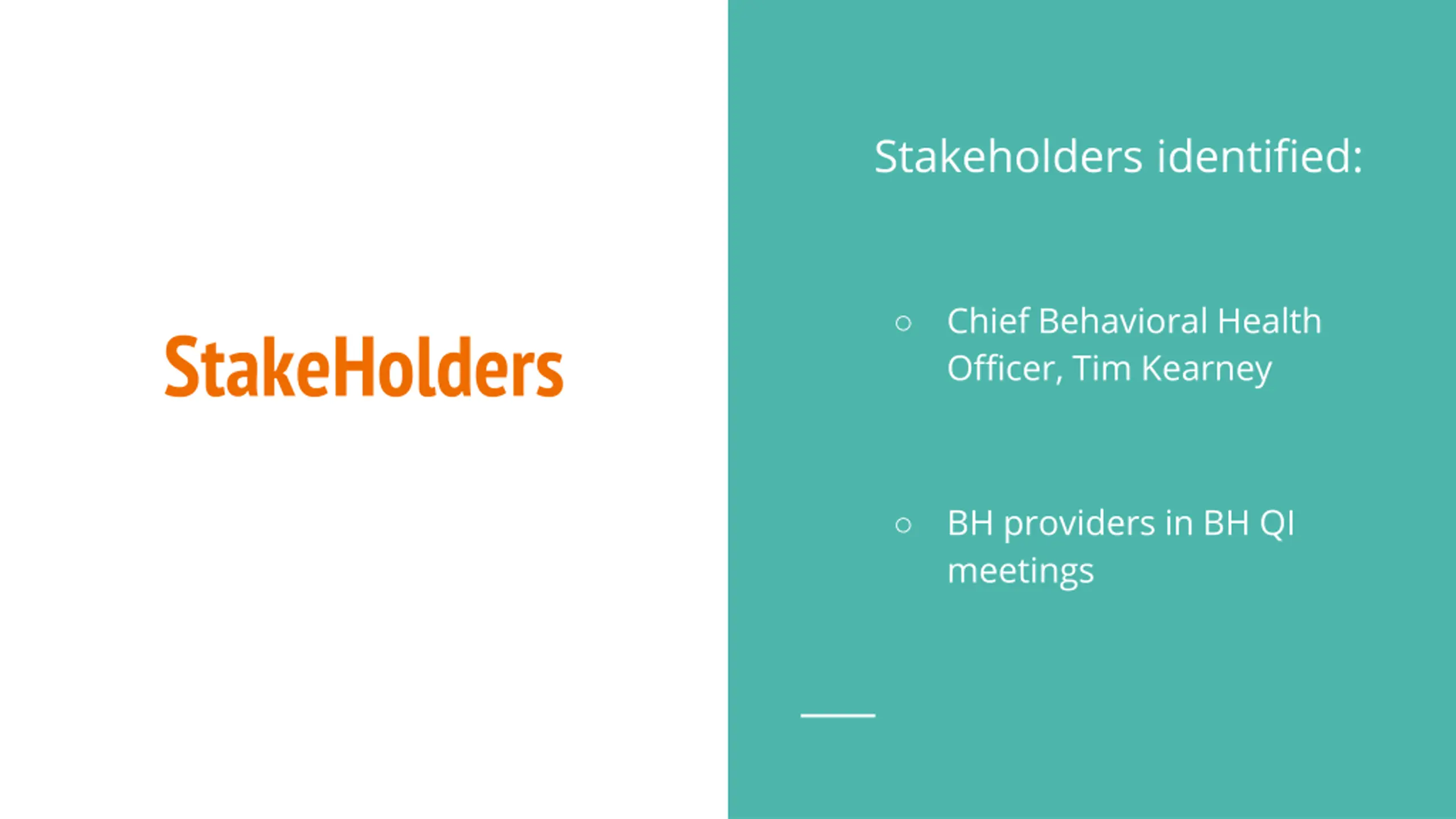 Stakeholders identified: Chief Behavioral Health Officer, Tim Kearney StakeHolders BH providers in BH QI meetings