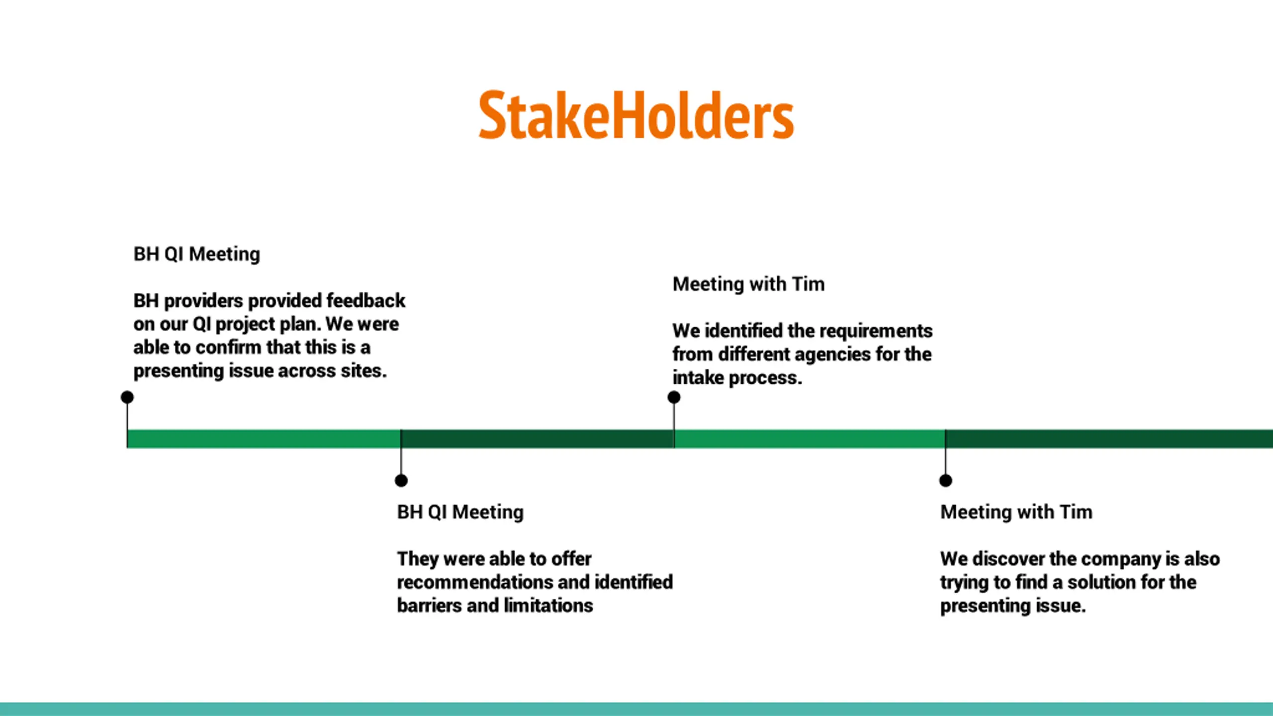 StakeHolders BH QI Meeting Meeting with Tim BH providers provided feedback on our QI project plan. We were able to confirm that this is a presenting issue across sites. We identified the requirements from different agencies for the intake process. BH QI Meeting Meeting with Tim They were able to offer recommendations and identified barriers and limitations We discover the company is also trying to find a solution for the presenting issue.