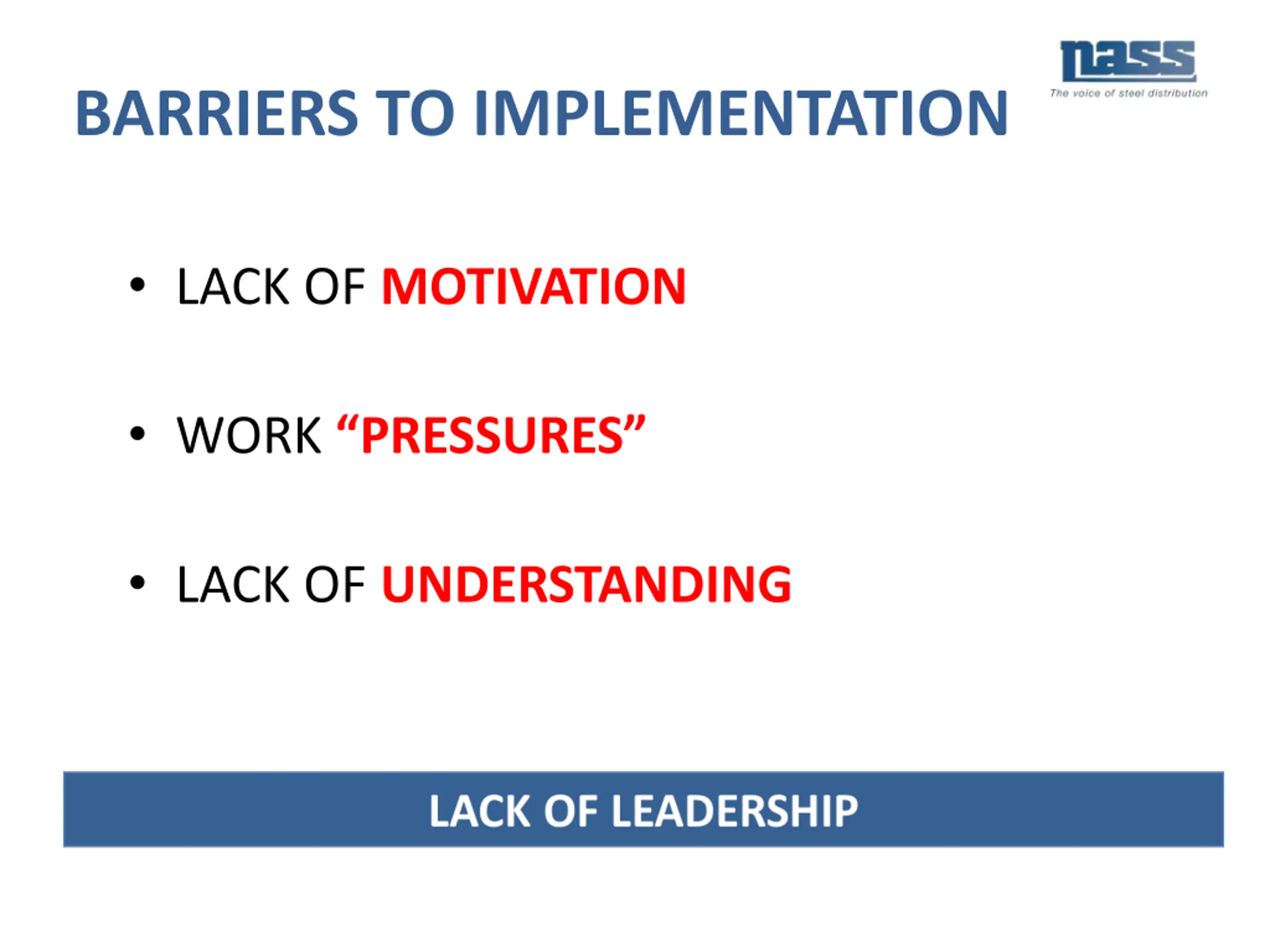 BARRIERS TO IMPLEMENTATION LACK OF MOTIVATION WORK PRESSURES LACK OF UNDERSTANDING