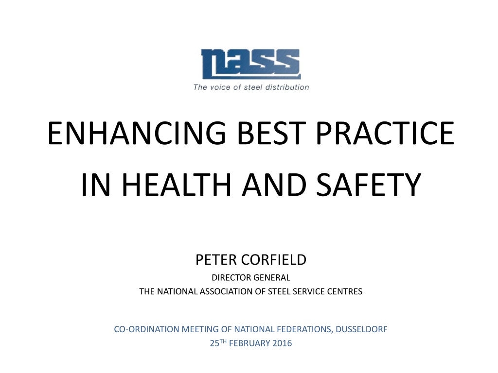 ENHANCING BEST PRACTICE IN HEALTH AND SAFETY PETER CORFIELD DIRECTOR GENERAL THE NATIONAL ASSOCIATION OF STEEL SERVICE CENTRES CO-ORDINATION MEETING OF NATIONAL FEDERATIONS, DUSSELDORF 25THFEBRUARY 2016