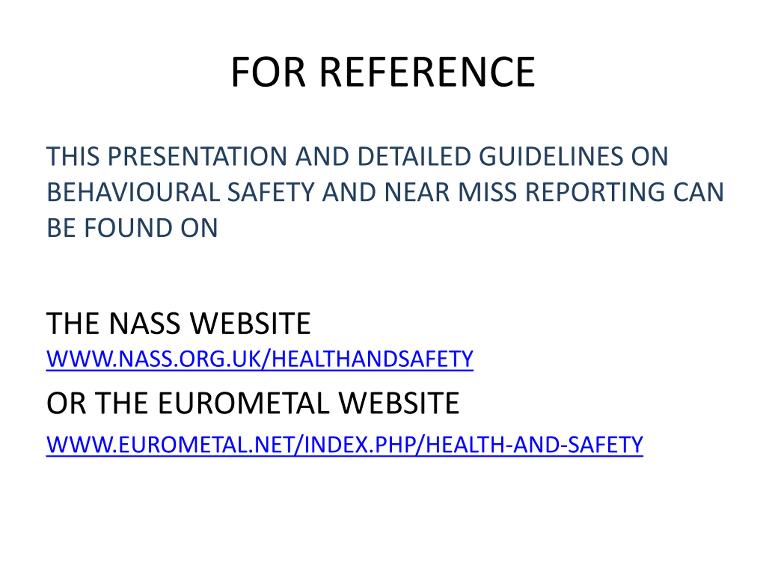 FOR REFERENCE THIS PRESENTATION AND DETAILED GUIDELINES ON BEHAVIOURAL SAFETY AND NEAR MISS REPORTING CAN BE FOUND ON THE NASS WEBSITE WWW.NASS.ORG.UK/HEALTHANDSAFETY OR THE EUROMETAL WEBSITE WWW.EUROMETAL.NET/INDEX.PHP/HEALTH-AND-SAFETY