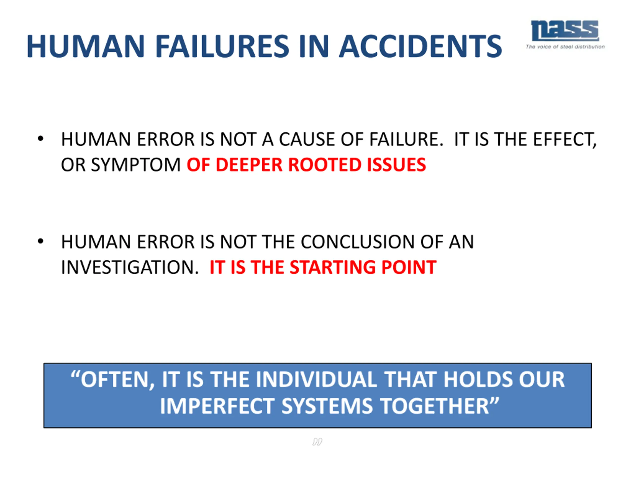 HUMAN FAILURES IN ACCIDENTS HUMAN ERROR IS NOT A CAUSE OF FAILURE. IT IS THE EFFECT, OR SYMPTOM OF DEEPER ROOTED ISSUES HUMAN ERROR IS NOT THE CONCLUSION OF AN INVESTIGATION. IT IS THE STARTING POINT