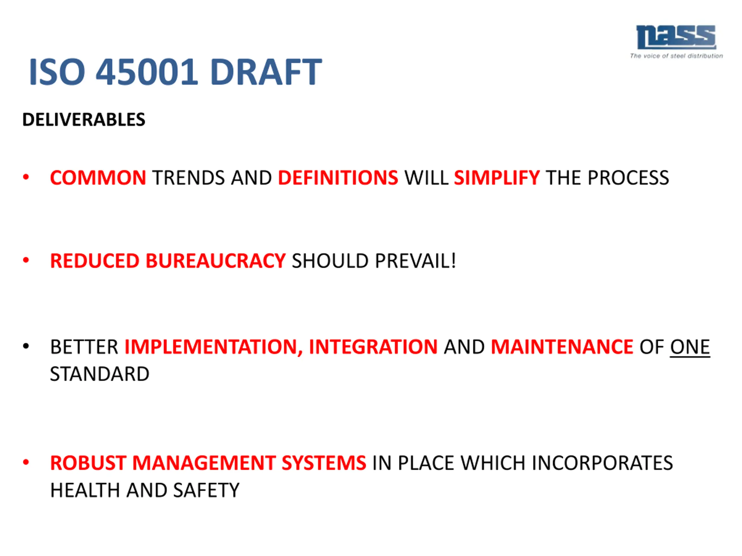 ISO 45001 DRAFT DELIVERABLES COMMON TRENDS AND DEFINITIONS WILL SIMPLIFY THE PROCESS REDUCED BUREAUCRACY SHOULD PREVAIL! BETTER IMPLEMENTATION, INTEGRATION AND MAINTENANCE OF ONE STANDARD ROBUST MANAGEMENT SYSTEMS IN PLACE WHICH INCORPORATES HEALTH AND SAFETY