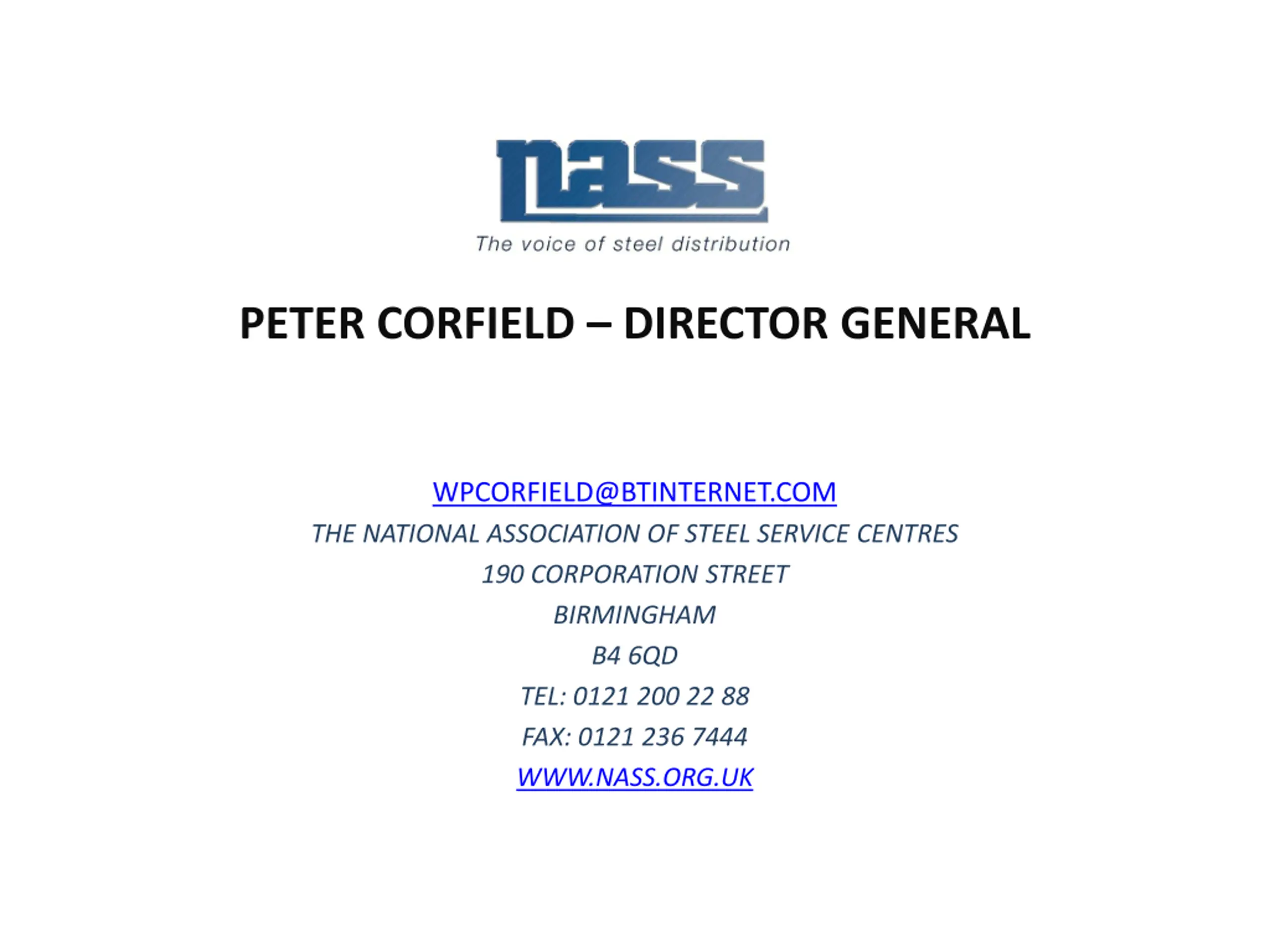 PETER CORFIELD DIRECTOR GENERAL WPCORFIELD@BTINTERNET.COM THE NATIONAL ASSOCIATION OF STEEL SERVICE CENTRES 190 CORPORATION STREET BIRMINGHAM B4 6QD TEL: 0121 200 22 88 FAX: 0121 236 7444 WWW.NASS.ORG.UK