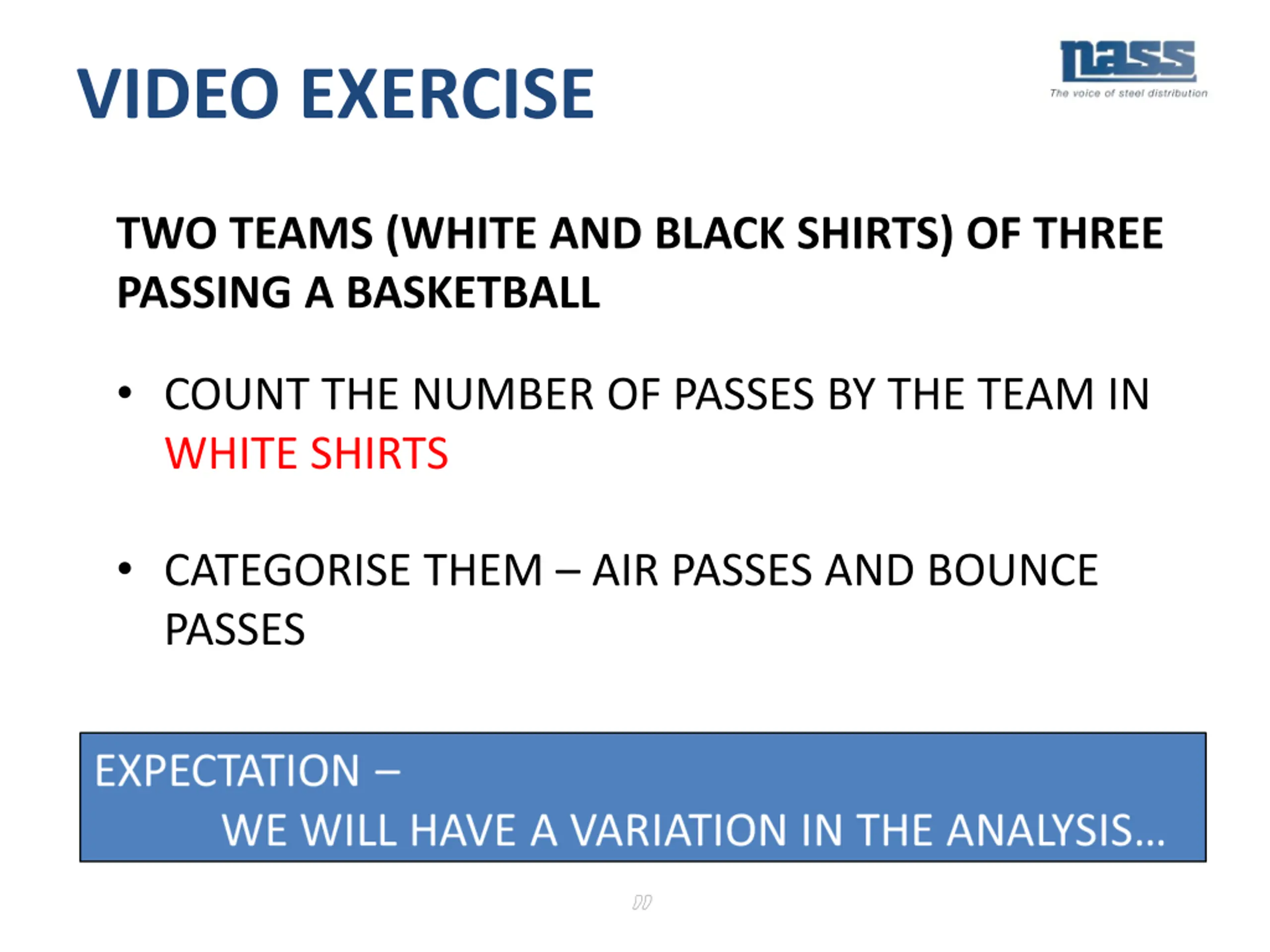 VIDEO EXERCISE TWO TEAMS (WHITE AND BLACK SHIRTS) OF THREE PASSING A BASKETBALL COUNT THE NUMBER OF PASSES BY THE TEAM IN WHITE SHIRTS CATEGORISE THEM AIR PASSES AND BOUNCE PASSES