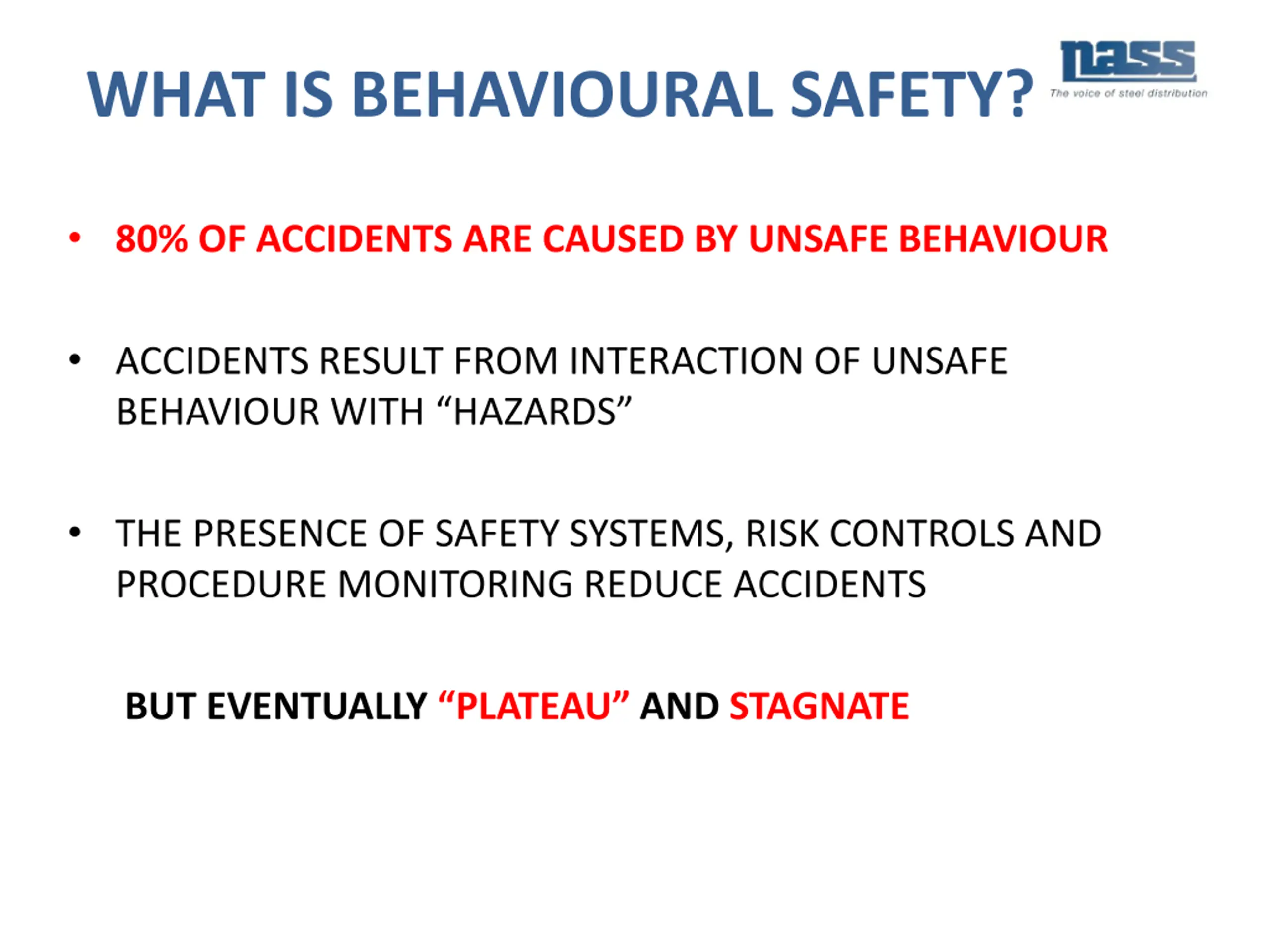 WHAT IS BEHAVIOURAL SAFETY? 80% OF ACCIDENTS ARE CAUSED BY UNSAFE BEHAVIOUR ACCIDENTS RESULT FROM INTERACTION OF UNSAFE BEHAVIOUR WITH HAZARDS THE PRESENCE OF SAFETY SYSTEMS, RISK CONTROLS AND PROCEDURE MONITORING REDUCE ACCIDENTS BUT EVENTUALLY PLATEAU AND STAGNATE