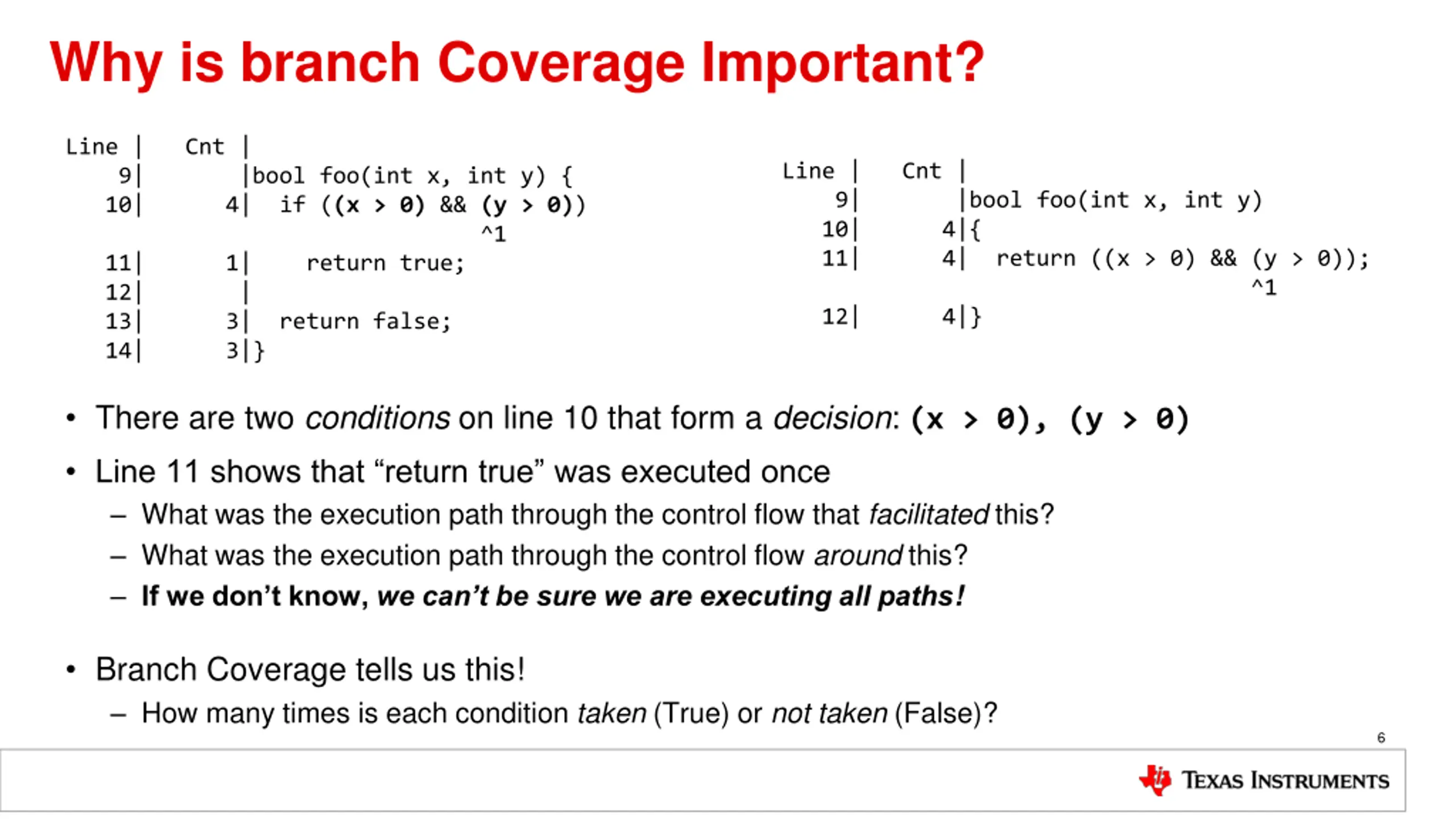 Why is branch Coverage Important? Line | Cnt | 9| |bool foo(int x, int y) { 10| 4| if ((x > 0) && (y > 0)) ^1 11| 1| return true; 12| | 13| 3| return false; 14| 3|} Line | Cnt | 9| |bool foo(int x, int y) 10| 4|{ 11| 4| return ((x > 0) && (y > 0)); 12| 4|} ^1 There are two conditions on line 10 that form a decision: (x > 0), (y > 0) Line 11 shows that return true was executed once What was the execution path through the control flow that facilitated this? What was the execution path through the control flow around this? If we don t know, we can t be sure we are executing all paths! Branch Coverage tells us this! How many times is each condition taken (True) or not taken (False)? 6