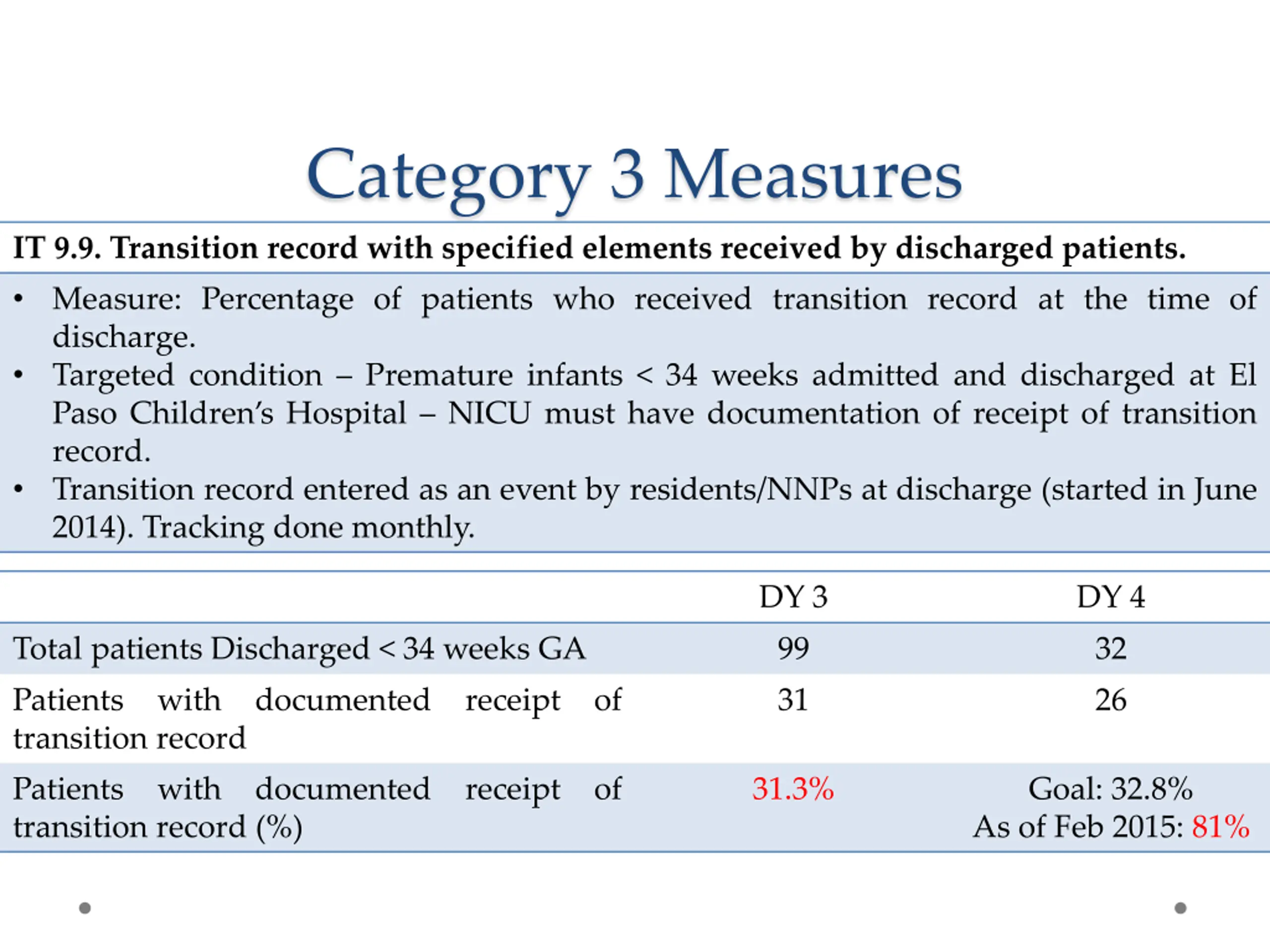 Category 3 Measures IT 9.9. Transition record with specified elements received by discharged patients. Measure: Percentage of patients who received transition record at the time of discharge. Targeted condition Premature infants < 34 weeks admitted and discharged at El Paso Children s Hospital NICU must have documentation of receipt of transition record. Transition record entered as an event by residents/NNPs at discharge (started in June 2014). Tracking done monthly. DY 3 DY 4 Total patients Discharged < 34 weeks GA 99 32 Patients transition record with documented receipt of 31 26 Patients transition record (%) with documented receipt of 31.3% Goal: 32.8% As of Feb 2015: 81%