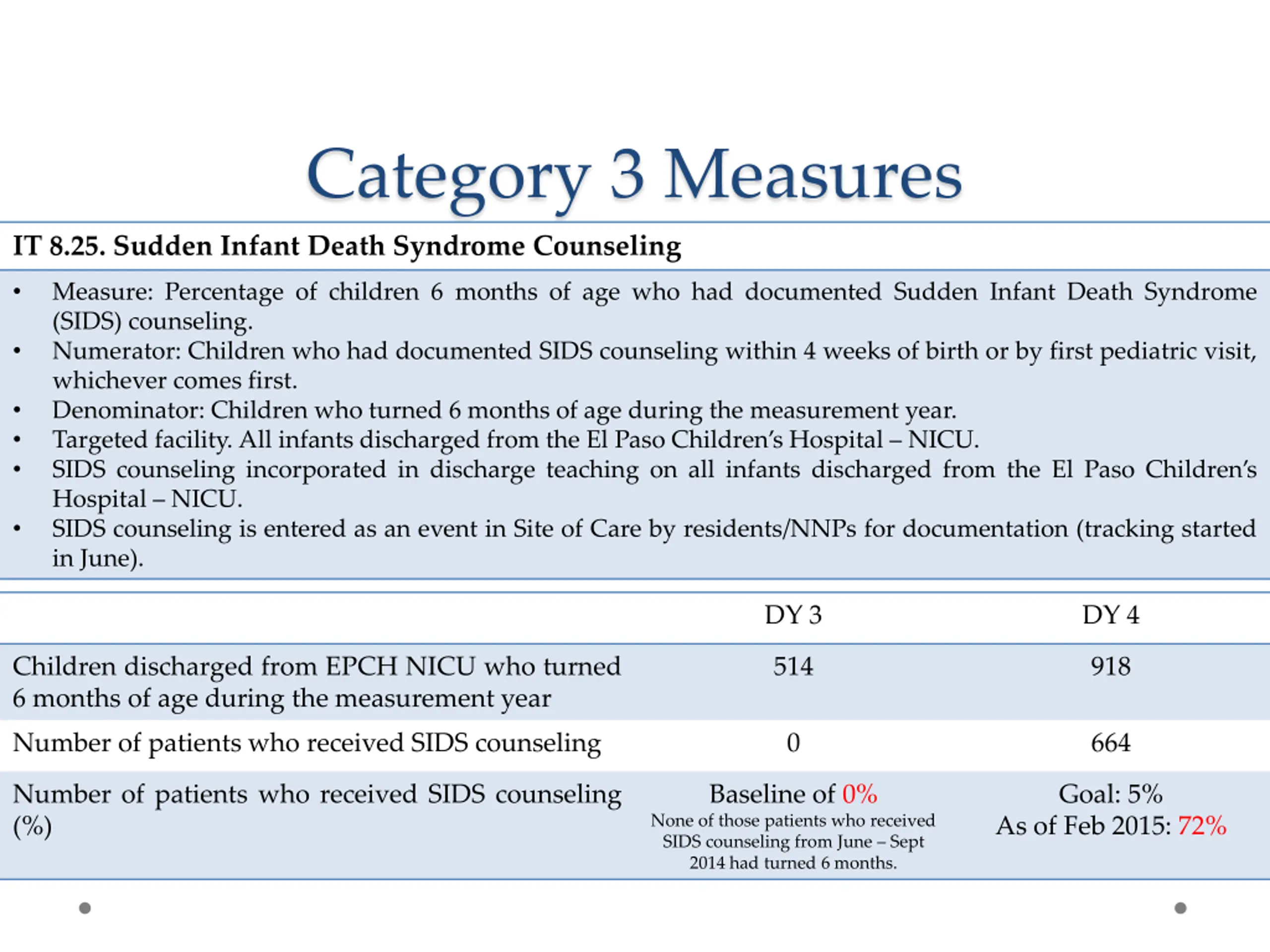 Category 3 Measures IT 8.25. Sudden Infant Death Syndrome Counseling Measure: Percentage of children 6 months of age who had documented Sudden Infant Death Syndrome (SIDS) counseling. Numerator: Children who had documented SIDS counseling within 4 weeks of birth or by first pediatric visit, whichever comes first. Denominator: Children who turned 6 months of age during the measurement year. Targeted facility. All infants discharged from the El Paso Children s Hospital NICU. SIDS counseling incorporated in discharge teaching on all infants discharged from the El Paso Children s Hospital NICU. SIDS counseling is entered as an event in Site of Care by residents/NNPs for documentation (tracking started in June). DY 3 DY 4 Children discharged from EPCH NICU who turned 6 months of age during the measurement year 514 918 Number of patients who received SIDS counseling 0 664 Number of patients who received SIDS counseling (%) Baseline of 0% None of those patients who received SIDS counseling from June Sept 2014 had turned 6 months. Goal: 5% As of Feb 2015: 72%