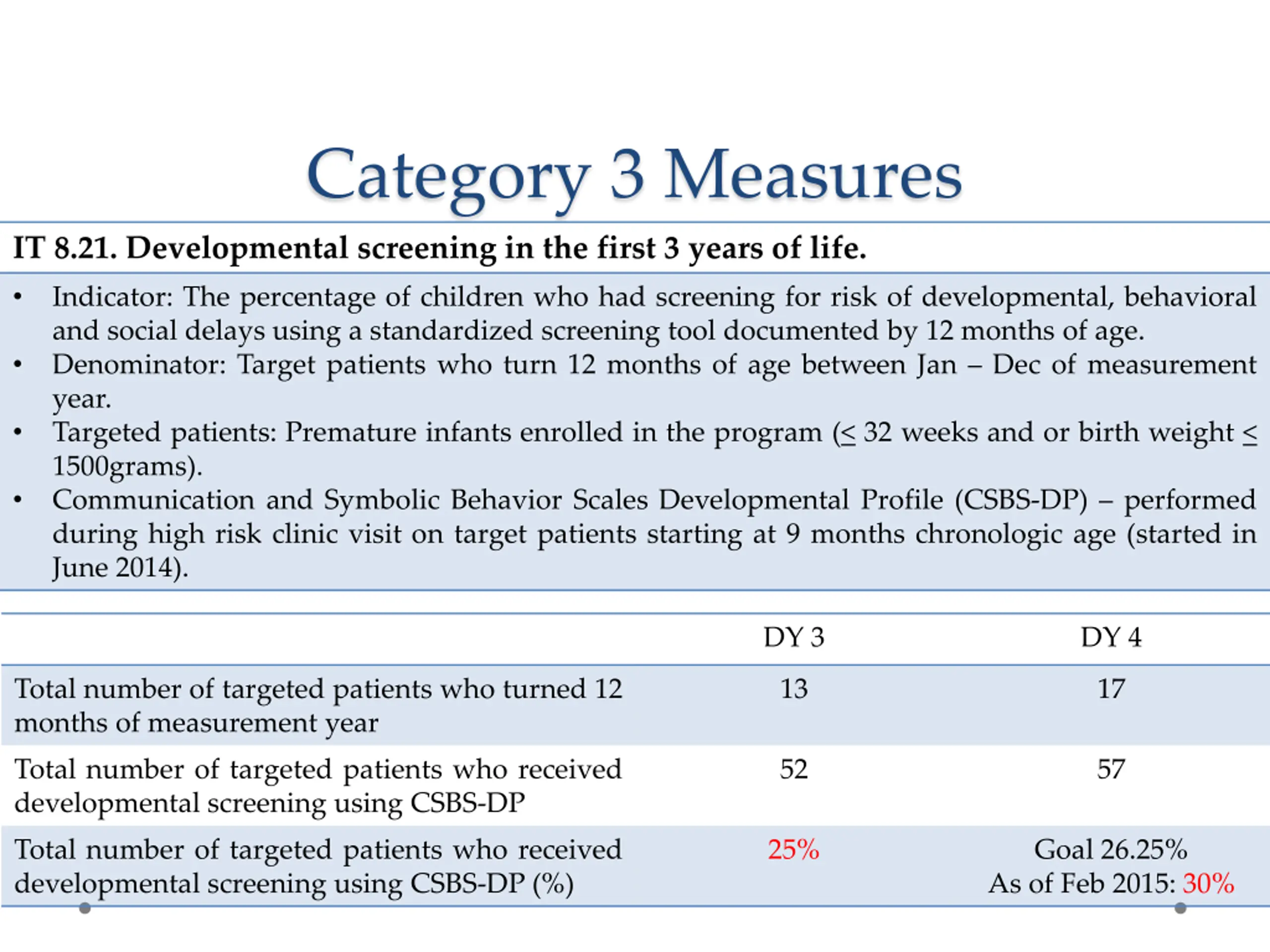 Category 3 Measures IT 8.21. Developmental screening in the first 3 years of life. Indicator: The percentage of children who had screening for risk of developmental, behavioral and social delays using a standardized screening tool documented by 12 months of age. Denominator: Target patients who turn 12 months of age between Jan Dec of measurement year. Targeted patients: Premature infants enrolled in the program (< 32 weeks and or birth weight < 1500grams). Communication and Symbolic Behavior Scales Developmental Profile (CSBS-DP) performed during high risk clinic visit on target patients starting at 9 months chronologic age (started in June 2014). DY 3 DY 4 Total number of targeted patients who turned 12 months of measurement year 13 17 Total number of targeted patients who received developmental screening using CSBS-DP 52 57 Total number of targeted patients who received developmental screening using CSBS-DP (%) 25% Goal 26.25% As of Feb 2015: 30%