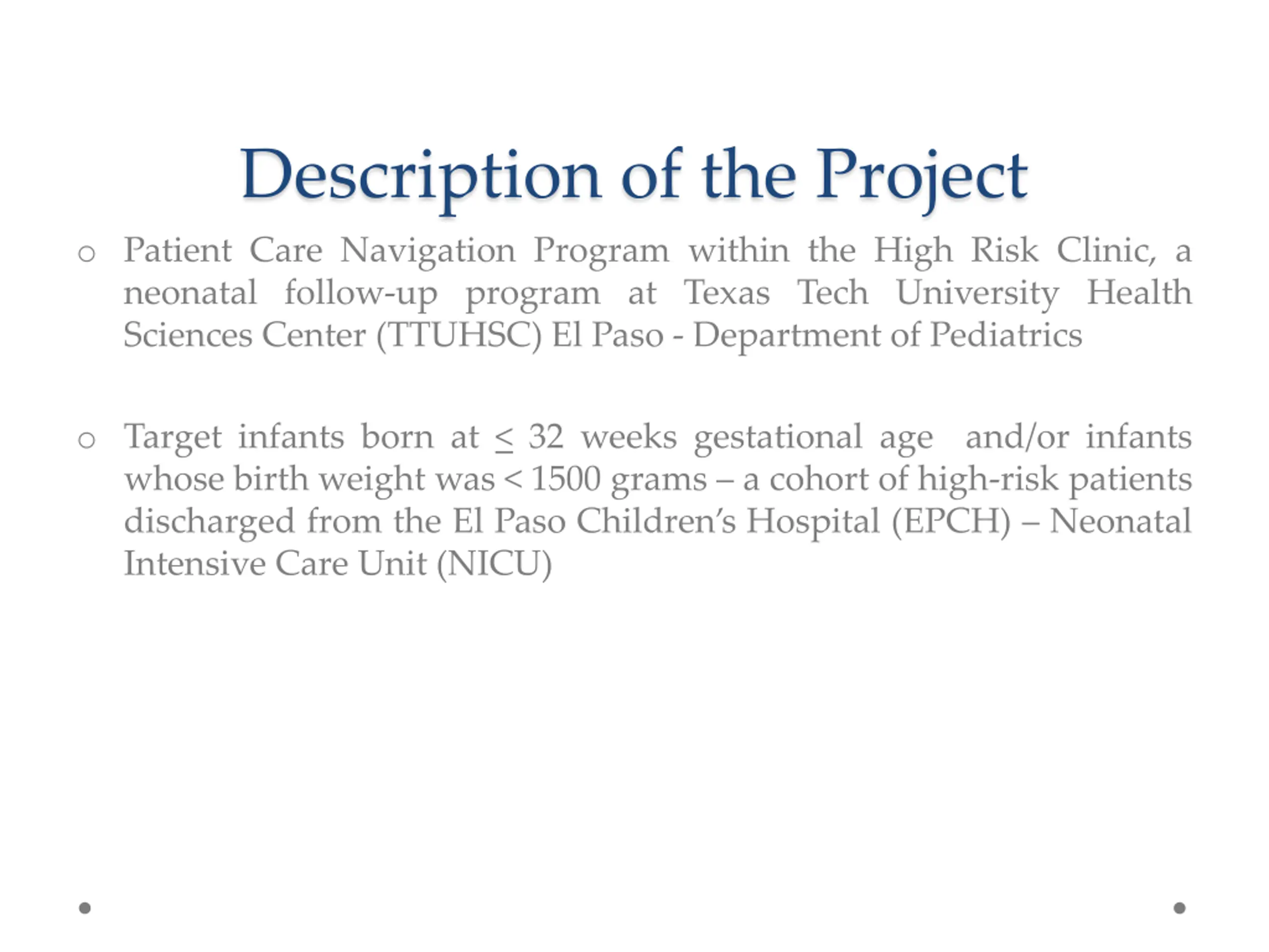 Description of the Project o Patient Care Navigation Program within the High Risk Clinic, a neonatal follow-up program at Texas Tech University Health Sciences Center (TTUHSC) El Paso - Department of Pediatrics o Target infants born at < 32 weeks gestational age and/or infants whose birth weight was < 1500 grams a cohort of high-risk patients discharged from the El Paso Children s Hospital (EPCH) Neonatal Intensive Care Unit (NICU)