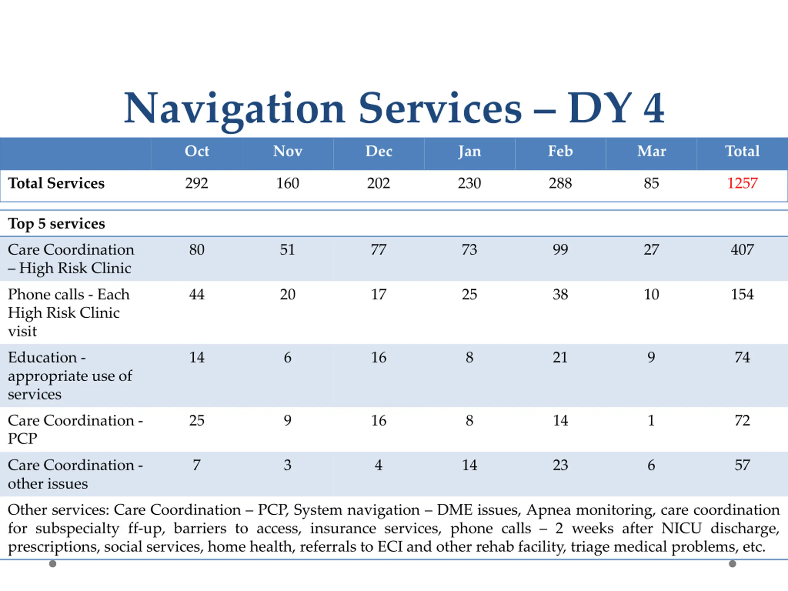 Navigation Services DY 4 Oct Nov Dec Jan Feb Mar Total Total Services 292 160 202 230 288 85 1257 Top 5 services Care Coordination High Risk Clinic 80 51 77 73 99 27 407 Phone calls - Each High Risk Clinic visit 44 20 17 25 38 10 154 Education - appropriate use of services 14 6 16 8 21 9 74 Care Coordination - PCP 25 9 16 8 14 1 72 Care Coordination - other issues 7 3 4 14 23 6 57 Other services: Care Coordination PCP, System navigation DME issues, Apnea monitoring, care coordination for subspecialty ff-up, barriers to access, insurance services, phone calls 2 weeks after NICU discharge, prescriptions, social services, home health, referrals to ECI and other rehab facility, triage medical problems, etc.