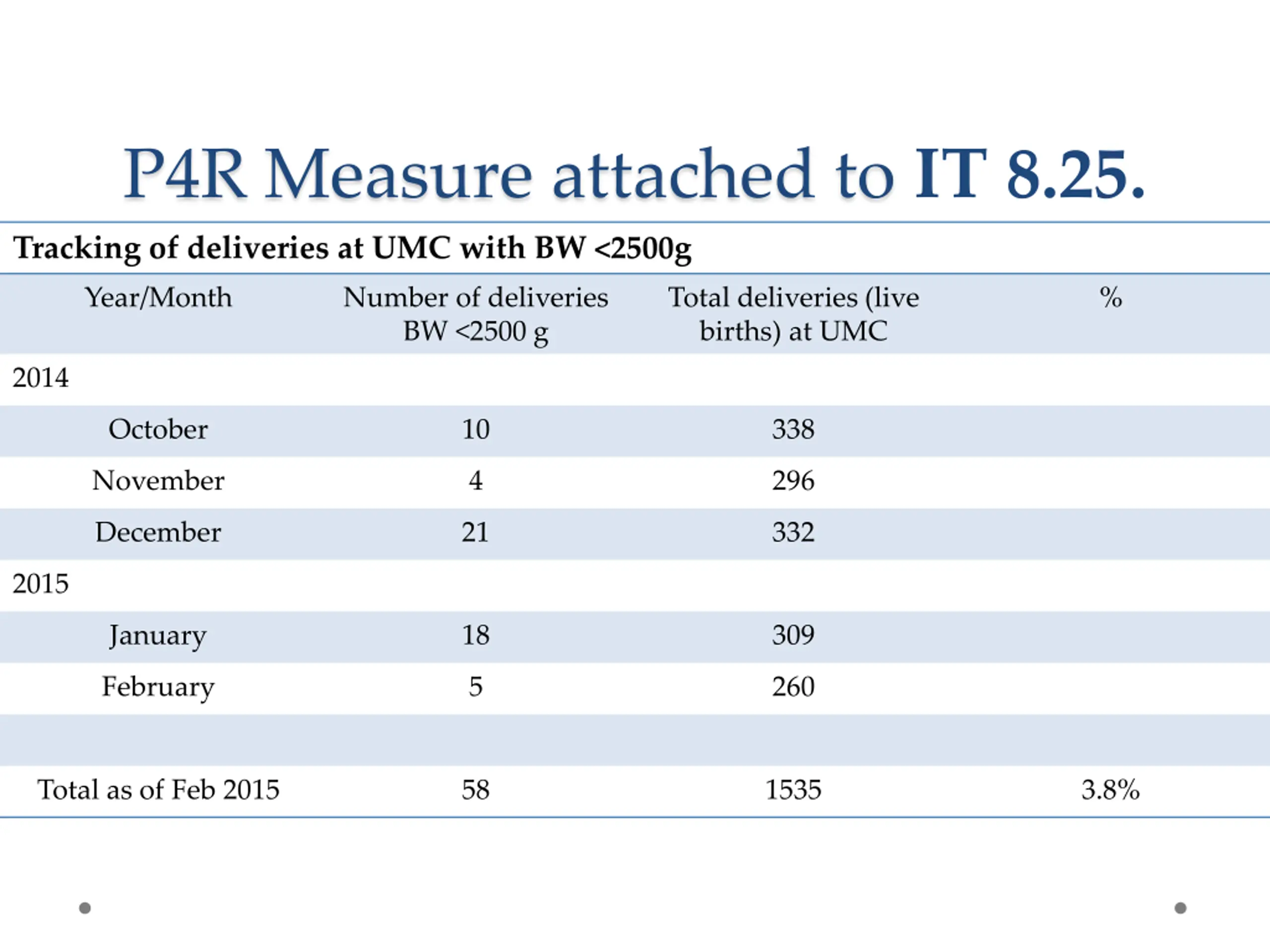 P4R Measure attached to IT 8.25. Tracking of deliveries at UMC with BW <2500g Year/Month Number of deliveries BW <2500 g Total deliveries (live births) at UMC % 2014 October 10 338 November 4 296 December 21 332 2015 January 18 309 February 5 260 Total as of Feb 2015 58 1535 3.8%