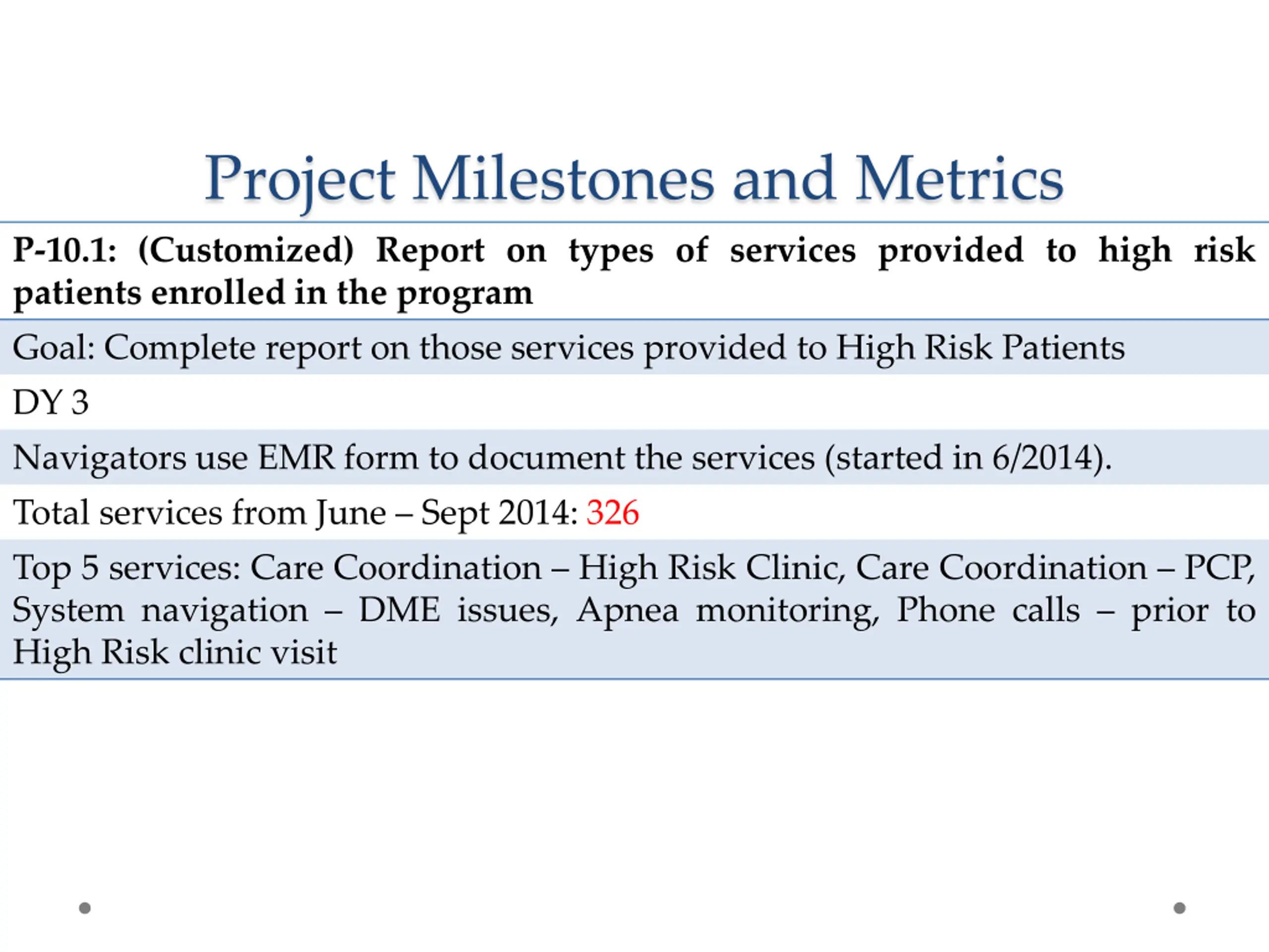 Project Milestones and Metrics P-10.1: (Customized) Report on types of services provided to high risk patients enrolled in the program Goal: Complete report on those services provided to High Risk Patients DY 3 Navigators use EMR form to document the services (started in 6/2014). Total services from June Sept 2014: 326 Top 5 services: Care Coordination High Risk Clinic, Care Coordination PCP, System navigation DME issues, Apnea monitoring, Phone calls prior to High Risk clinic visit
