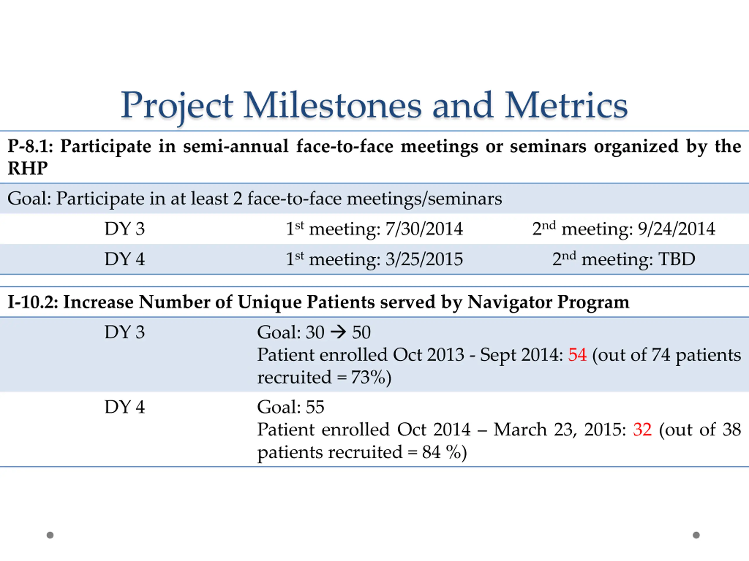 Project Milestones and Metrics P-8.1: Participate in semi annual face-to-face meetings or seminars organized by the RHP Goal: Participate in at least 2 face-to-face meetings/seminars 1stmeeting: 7/30/2014 2ndmeeting: 9/24/2014 DY 3 1stmeeting: 3/25/2015 2ndmeeting: TBD DY 4 I-10.2: Increase Number of Unique Patients served by Navigator Program Goal: 30 50 Patient enrolled Oct 2013 - Sept 2014: 54 (out of 74 patients recruited = 73%) DY 3 DY 4 Goal: 55 Patient enrolled Oct 2014 March 23, 2015: 32 (out of 38 patients recruited = 84 %)