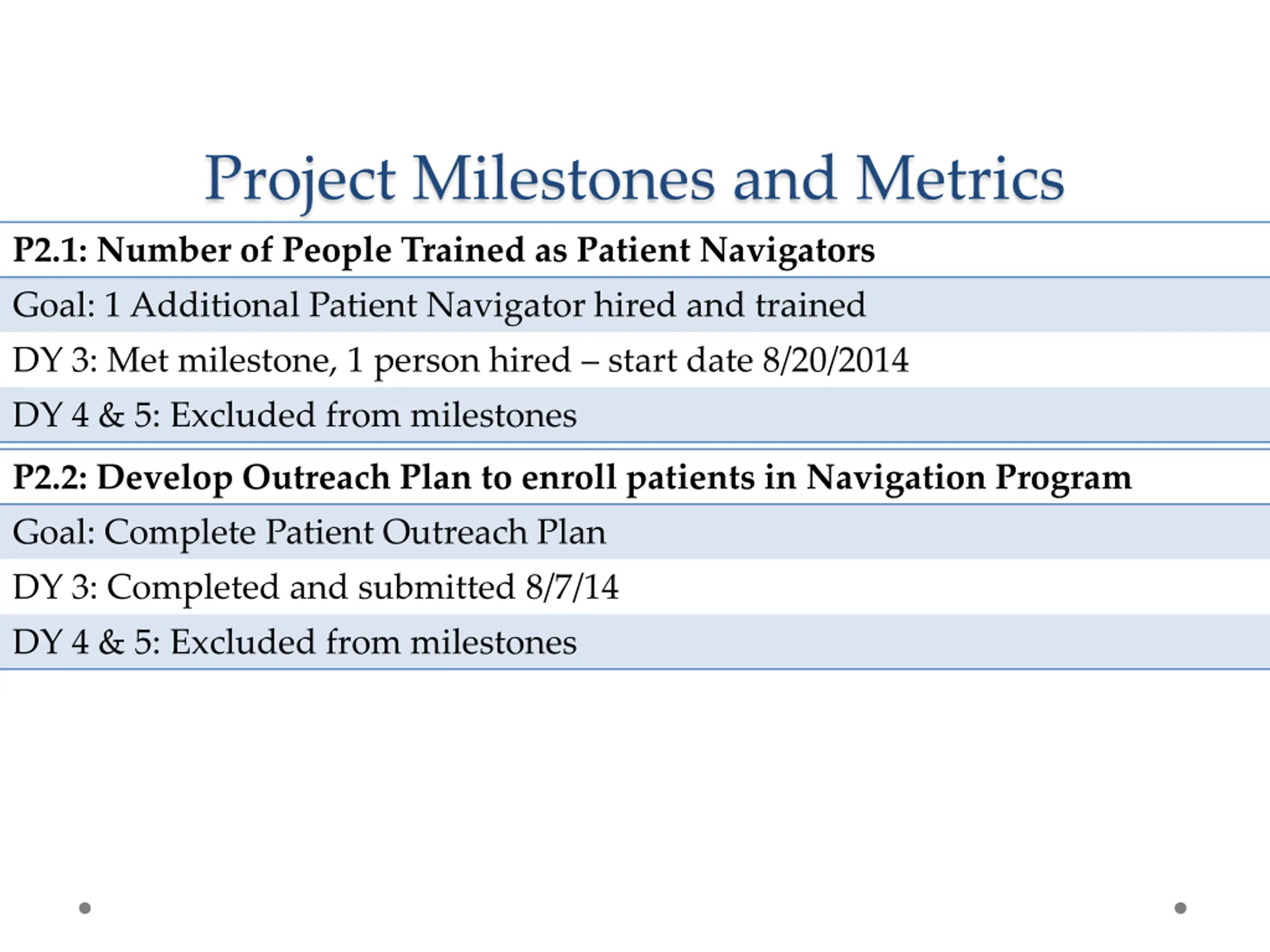 Project Milestones and Metrics P2.1: Number of People Trained as Patient Navigators Goal: 1 Additional Patient Navigator hired and trained DY 3: Met milestone, 1 person hired start date 8/20/2014 DY 4 & 5: Excluded from milestones P2.2: Develop Outreach Plan to enroll patients in Navigation Program Goal: Complete Patient Outreach Plan DY 3: Completed and submitted 8/7/14 DY 4 & 5: Excluded from milestones