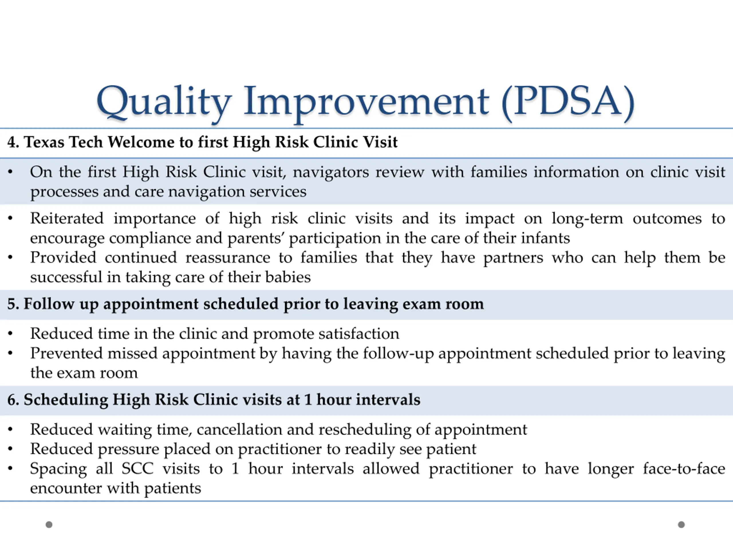 Quality Improvement (PDSA) 4. Texas Tech Welcome to first High Risk Clinic Visit On the first High Risk Clinic visit, navigators review with families information on clinic visit processes and care navigation services Reiterated importance of high risk clinic visits and its impact on long-term outcomes to encourage compliance and parents participation in the care of their infants Provided continued reassurance to families that they have partners who can help them be successful in taking care of their babies 5. Follow up appointment scheduled prior to leaving exam room Reduced time in the clinic and promote satisfaction Prevented missed appointment by having the follow-up appointment scheduled prior to leaving the exam room 6. Scheduling High Risk Clinic visits at 1 hour intervals Reduced waiting time, cancellation and rescheduling of appointment Reduced pressure placed on practitioner to readily see patient Spacing all SCC visits to 1 hour intervals allowed practitioner to have longer face-to-face encounter with patients