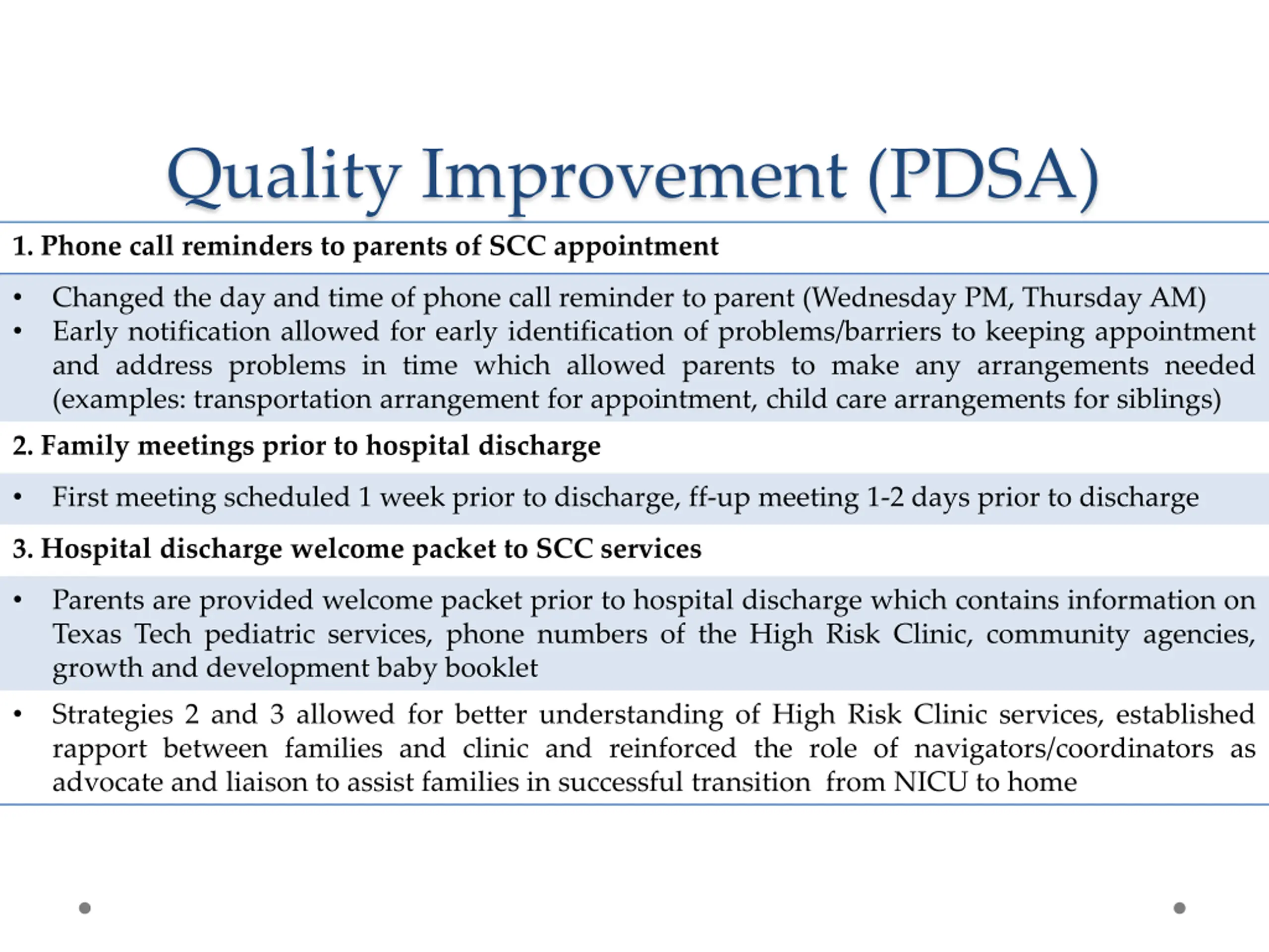 Quality Improvement (PDSA) 1. Phone call reminders to parents of SCC appointment Changed the day and time of phone call reminder to parent (Wednesday PM, Thursday AM) Early notification allowed for early identification of problems/barriers to keeping appointment and address problems in time which allowed parents to make any arrangements needed (examples: transportation arrangement for appointment, child care arrangements for siblings) 2. Family meetings prior to hospital discharge First meeting scheduled 1 week prior to discharge, ff-up meeting 1-2 days prior to discharge 3. Hospital discharge welcome packet to SCC services Parents are provided welcome packet prior to hospital discharge which contains information on Texas Tech pediatric services, phone numbers of the High Risk Clinic, community agencies, growth and development baby booklet Strategies 2 and 3 allowed for better understanding of High Risk Clinic services, established rapport between families and clinic and reinforced the role of navigators/coordinators as advocate and liaison to assist families in successful transition from NICU to home