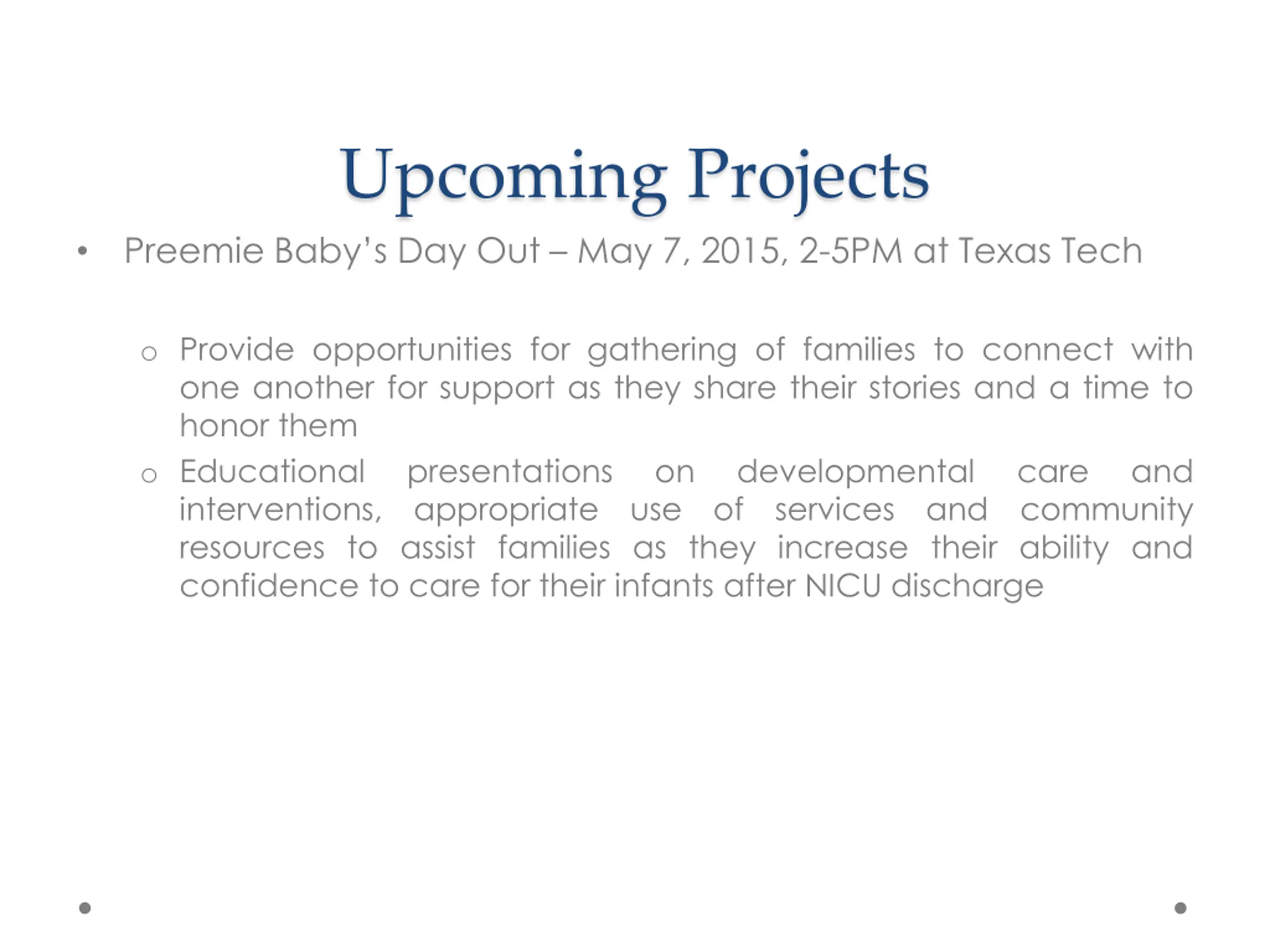 Upcoming Projects Preemie Baby s Day Out May 7, 2015, 2-5PM at Texas Tech o Provide opportunities for gathering of families to connect with one another for support as they share their stories and a time to honor them o Educational presentations on interventions, appropriate use resources to assist families as they increase their ability and confidence to care for their infants after NICU discharge developmental of services care community and and