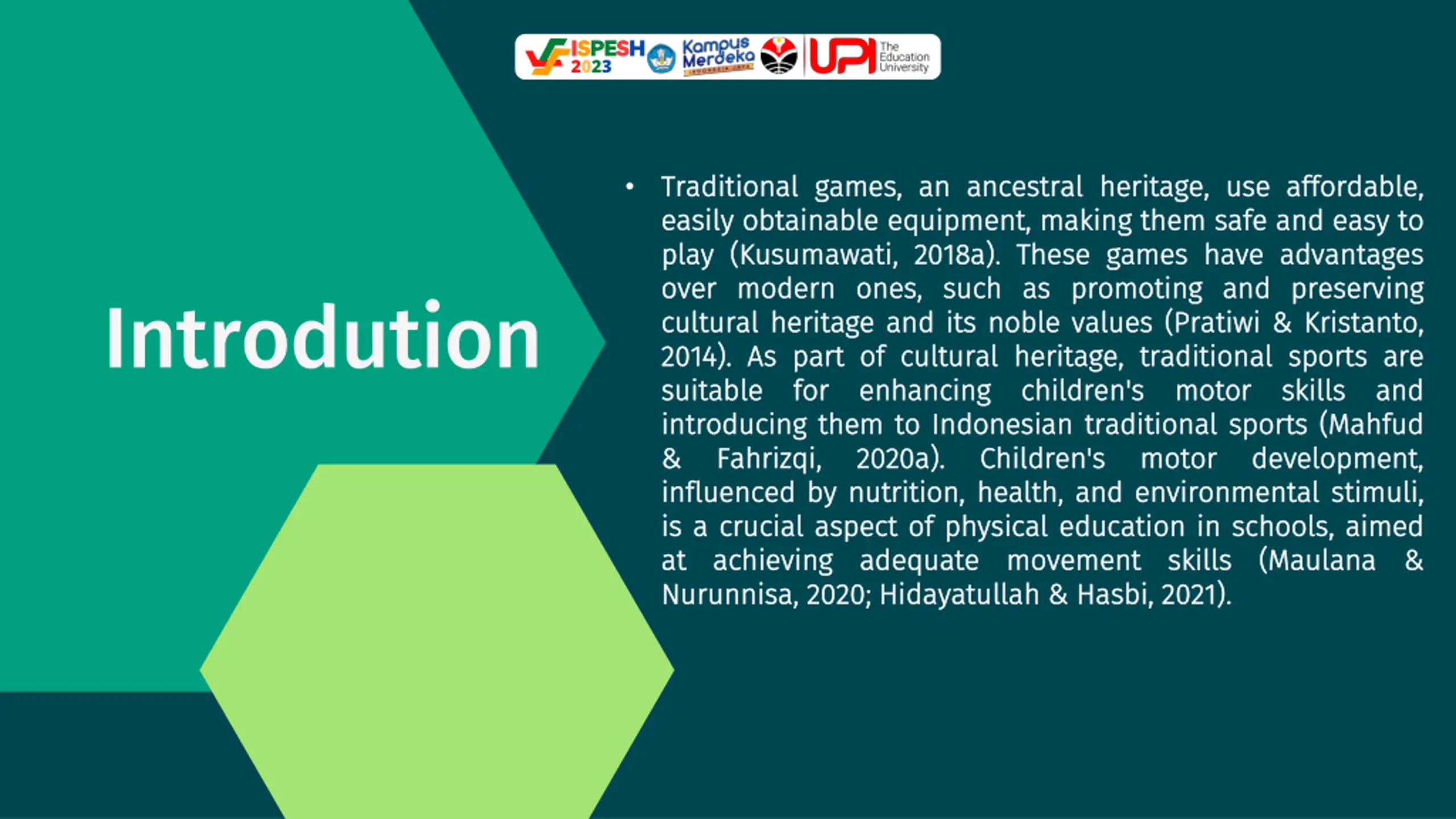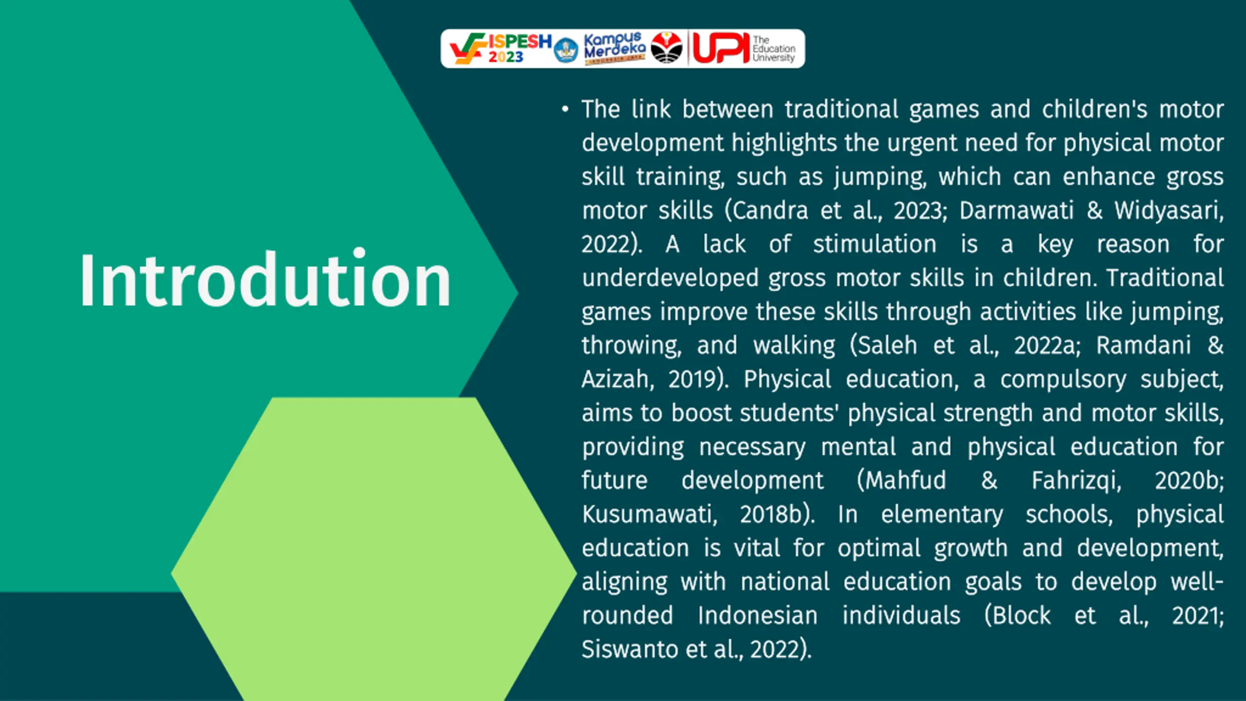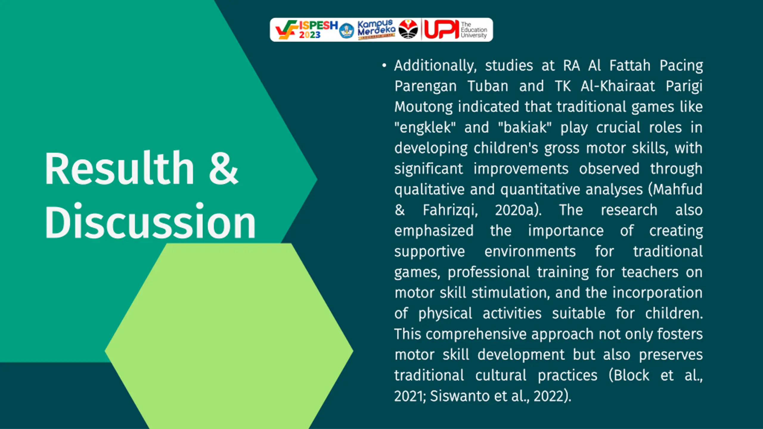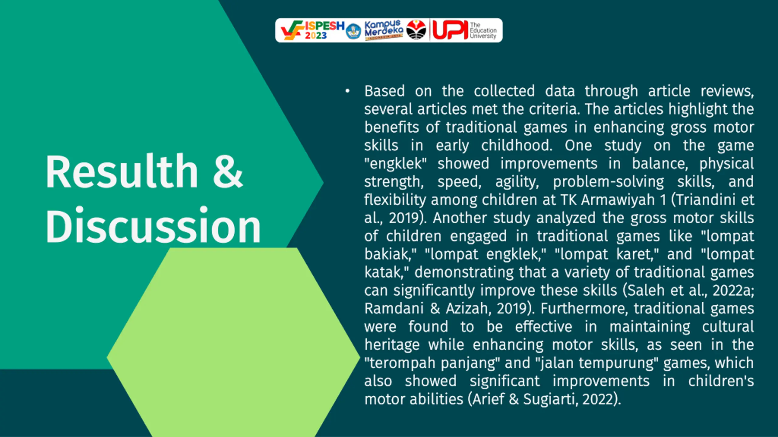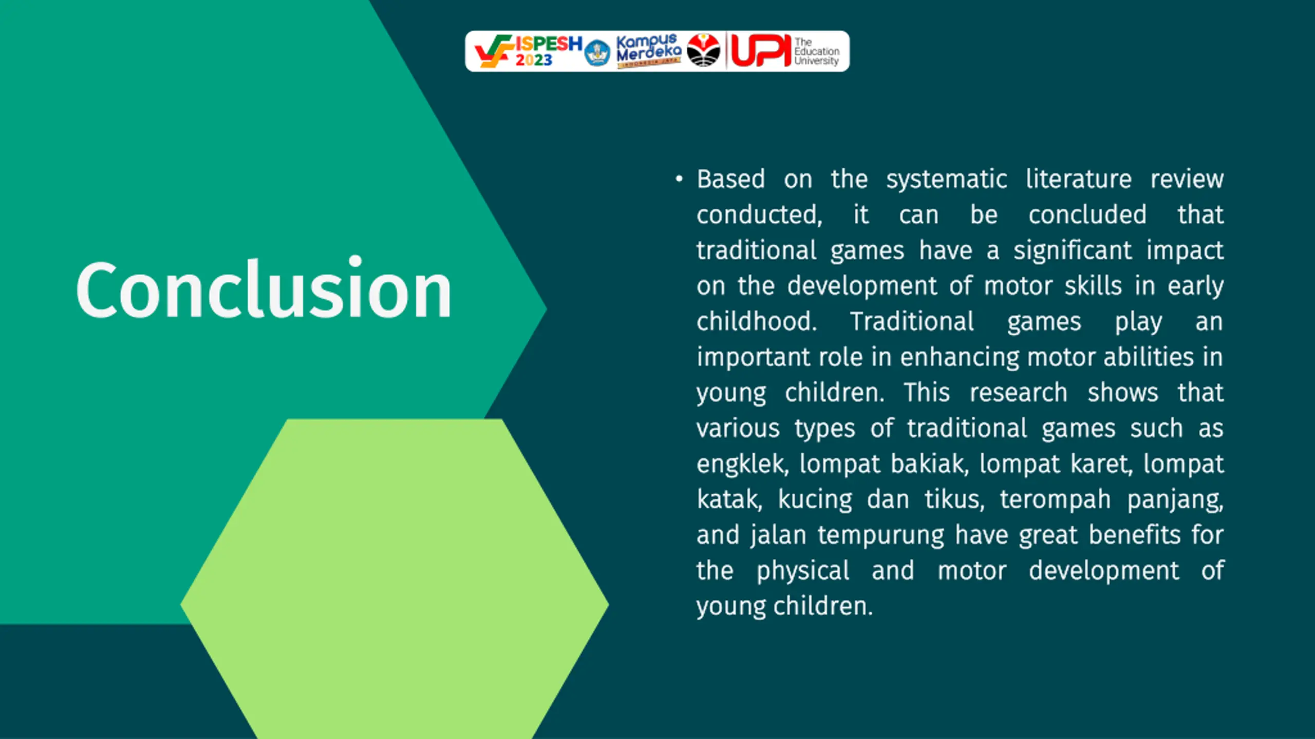 ISPESH 2023 Based Based on conducted, conducted, traditional traditional games on on the the development development of of motor childhood childhood. . Traditional Traditional important important role role in in enhancing young young children children. . This various various types types of of traditional engklek engklek, , lompat lompat bakiak katak katak, , kucing kucing dan and and jalan jalan tempurung tempurung have the the physical physical and young young children children. . on the the systematic systematic literature it it can can be be games have have a a significant literature review concluded concluded significant impact motor skills skills in in early games games enhancing motor motor abilities This research research shows traditional games games such bakiak, , lompat lompat karet dan tikus tikus, , terompah terompah panjang have great great benefits and motor motor development development of of review that that impact early play play abilities in in shows that such as karet, , lompat lompat panjang, , benefits for Conclusion an an that as for