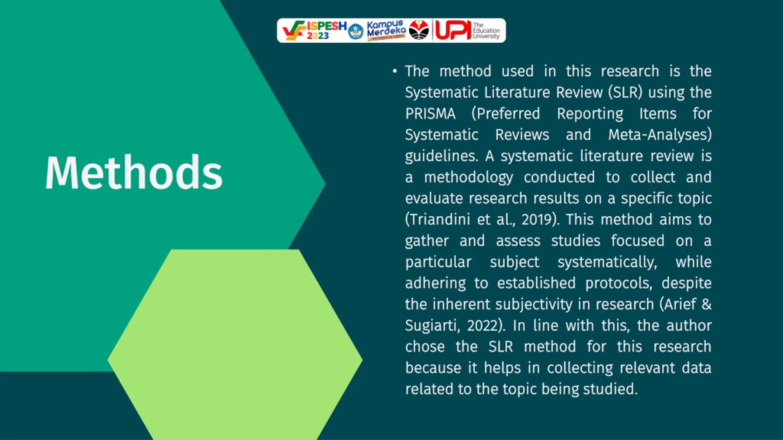 ISPESH 2023 The The method method used Systematic Systematic Literature PRISMA PRISMA (Preferred Systematic Systematic Reviews guidelines guidelines. . A A systematic a a methodology methodology conducted evaluate evaluate research research results ( (Triandini Triandini et et al al. ., , 2019 gather gather and and assess particular particular subject subject adhering adhering to to established the the inherent inherent subjectivity Sugiarti Sugiarti, , 2022 2022) ). . In In line chose chose the the SLR SLR method because because it it helps helps in in collecting related related to to the the topic used in in this Literature Review (Preferred Reporting Reviews and systematic literature conducted to results on 2019) ). . This assess studies studies focused systematically, systematically, established protocols, subjectivity in in research line with with this, method for collecting relevant topic being being studied this research research is is the Review (SLR) (SLR) using Reporting Items and Meta Meta- -Analyses) literature review to collect collect and on a a specific specific topic This method method aims focused on the the for using the Items for Analyses) review is is Methods and topic aims to on a a while while despite Arief & & the author author this research research relevant data studied. . to protocols, despite research ( (Arief this, the for this data