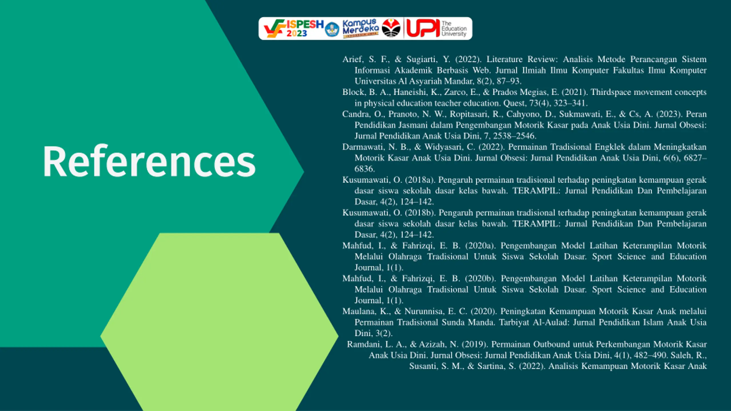 ISPESH 2023 Arief, S. F., & Sugiarti, Y. (2022). Literature Review: Analisis Metode Perancangan Sistem Informasi Akademik Berbasis Web. Jurnal Ilmiah Ilmu Komputer Fakultas Ilmu Komputer UniversitasAlAsyariah Mandar, 8(2), 87 93. Block, B. A., Haneishi, K., Zarco, E., & Prados Megias, E. (2021). Thirdspace movement concepts in physical education teacher education. Quest, 73(4), 323 341. Candra, O., Pranoto, N. W., Ropitasari, R., Cahyono, D., Sukmawati, E., & Cs, A. (2023). Peran Pendidikan Jasmani dalam Pengembangan Motorik Kasar pada Anak Usia Dini. Jurnal Obsesi: Jurnal PendidikanAnak Usia Dini, 7, 2538 2546. Darmawati, N. B., & Widyasari, C. (2022). Permainan Tradisional Engklek dalam Meningkatkan Motorik Kasar Anak Usia Dini. Jurnal Obsesi: Jurnal Pendidikan Anak Usia Dini, 6(6), 6827 6836. Kusumawati, O. (2018a). Pengaruh permainan tradisional terhadap peningkatan kemampuan gerak dasar siswa sekolah dasar kelas bawah. TERAMPIL: Jurnal Pendidikan Dan Pembelajaran Dasar, 4(2), 124 142. Kusumawati, O. (2018b). Pengaruh permainan tradisional terhadap peningkatan kemampuan gerak dasar siswa sekolah dasar kelas bawah. TERAMPIL: Jurnal Pendidikan Dan Pembelajaran Dasar, 4(2), 124 142. Mahfud, I., & Fahrizqi, E. B. (2020a). Pengembangan Model Latihan Keterampilan Motorik Melalui Olahraga Tradisional Untuk Siswa Sekolah Dasar. Sport Science and Education Journal, 1(1). Mahfud, I., & Fahrizqi, E. B. (2020b). Pengembangan Model Latihan Keterampilan Motorik Melalui Olahraga Tradisional Untuk Siswa Sekolah Dasar. Sport Science and Education Journal, 1(1). Maulana, K., & Nurunnisa, E. C. (2020). Peningkatan Kemampuan Motorik Kasar Anak melalui Permainan Tradisional Sunda Manda. Tarbiyat Al-Aulad: Jurnal Pendidikan Islam Anak Usia Dini, 3(2). Ramdani, L. A., & Azizah, N. (2019). Permainan Outbound untuk Perkembangan Motorik Kasar Anak Usia Dini. Jurnal Obsesi: Jurnal Pendidikan Anak Usia Dini, 4(1), 482 490. Saleh, R., Susanti, S. M., & Sartina, S. (2022). Analisis Kemampuan Motorik Kasar Anak References