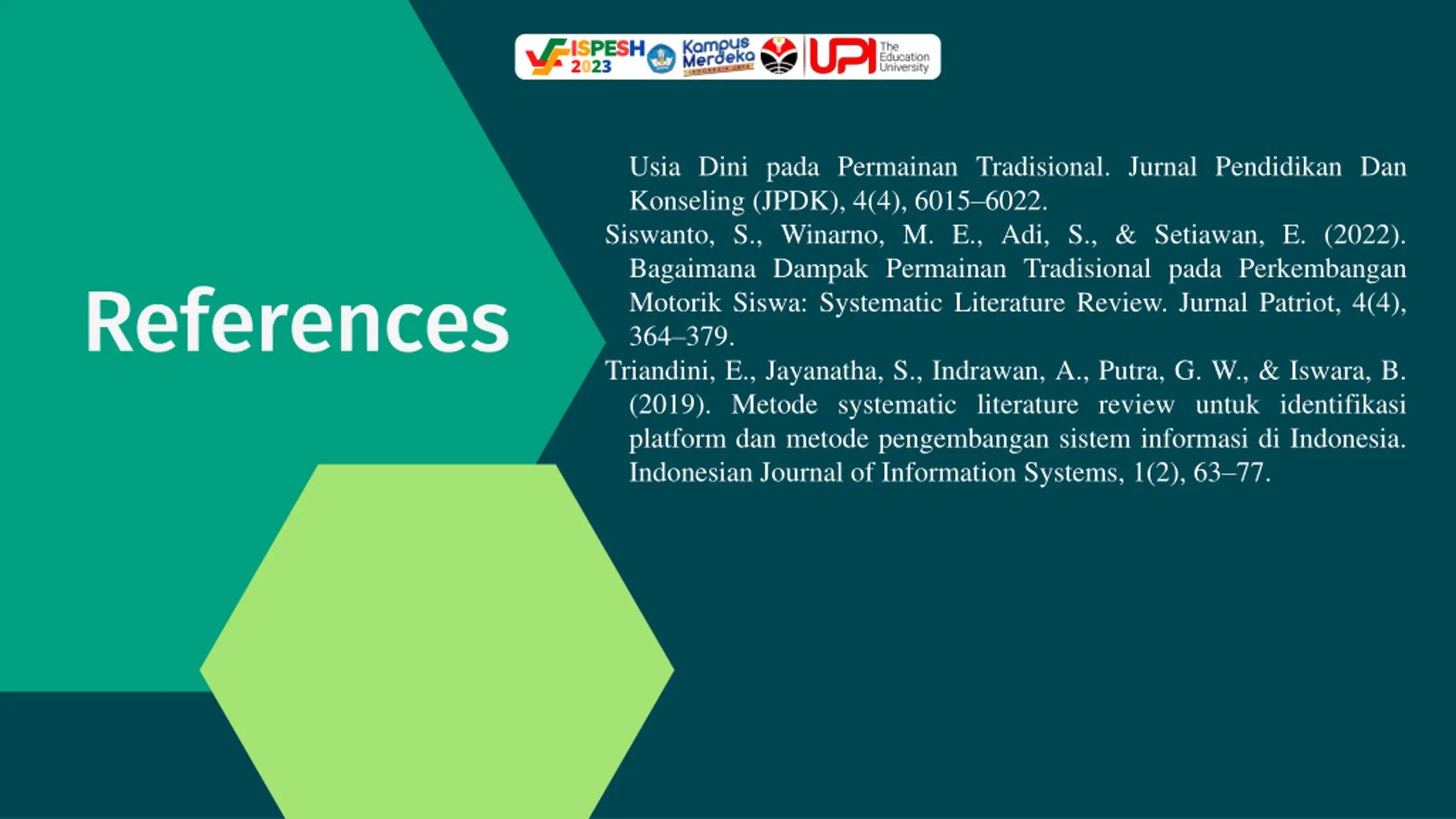 ISPESH 2023 Usia Dini pada Permainan Tradisional. Jurnal Pendidikan Dan Konseling (JPDK), 4(4), 6015 6022. Siswanto, S., Winarno, M. E., Adi, S., & Setiawan, E. (2022). Bagaimana Dampak Permainan Tradisional pada Perkembangan Motorik Siswa: Systematic Literature Review. Jurnal Patriot, 4(4), 364 379. Triandini, E., Jayanatha, S., Indrawan, A., Putra, G. W., & Iswara, B. (2019). Metode systematic literature review untuk identifikasi platform dan metode pengembangan sistem informasi di Indonesia. Indonesian Journal of Information Systems, 1(2), 63 77. References