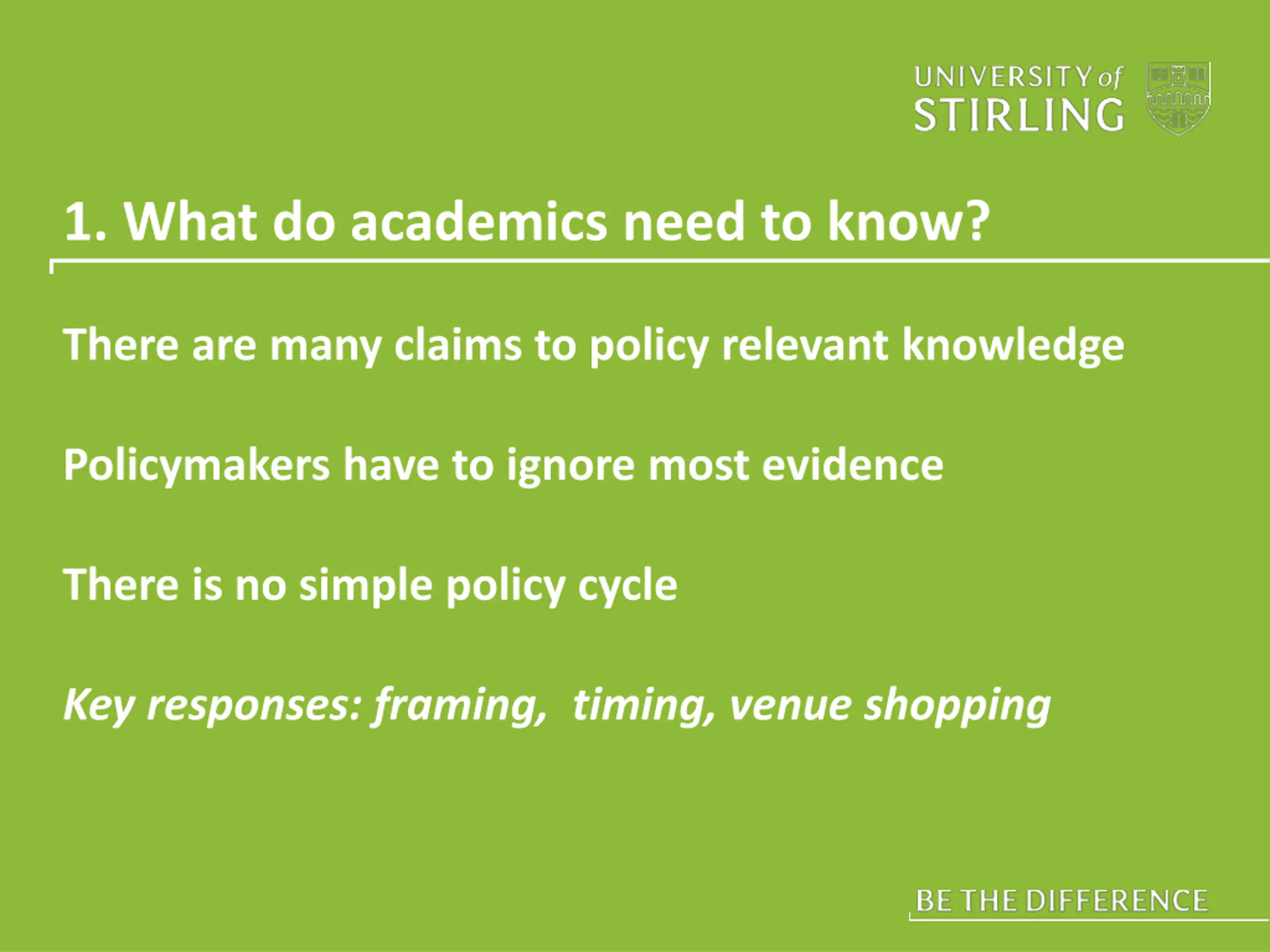 1. What do academics need to know? There are many claims to policy relevant knowledge Policymakers have to ignore most evidence There is no simple policy cycle Key responses: framing, timing, venue shopping