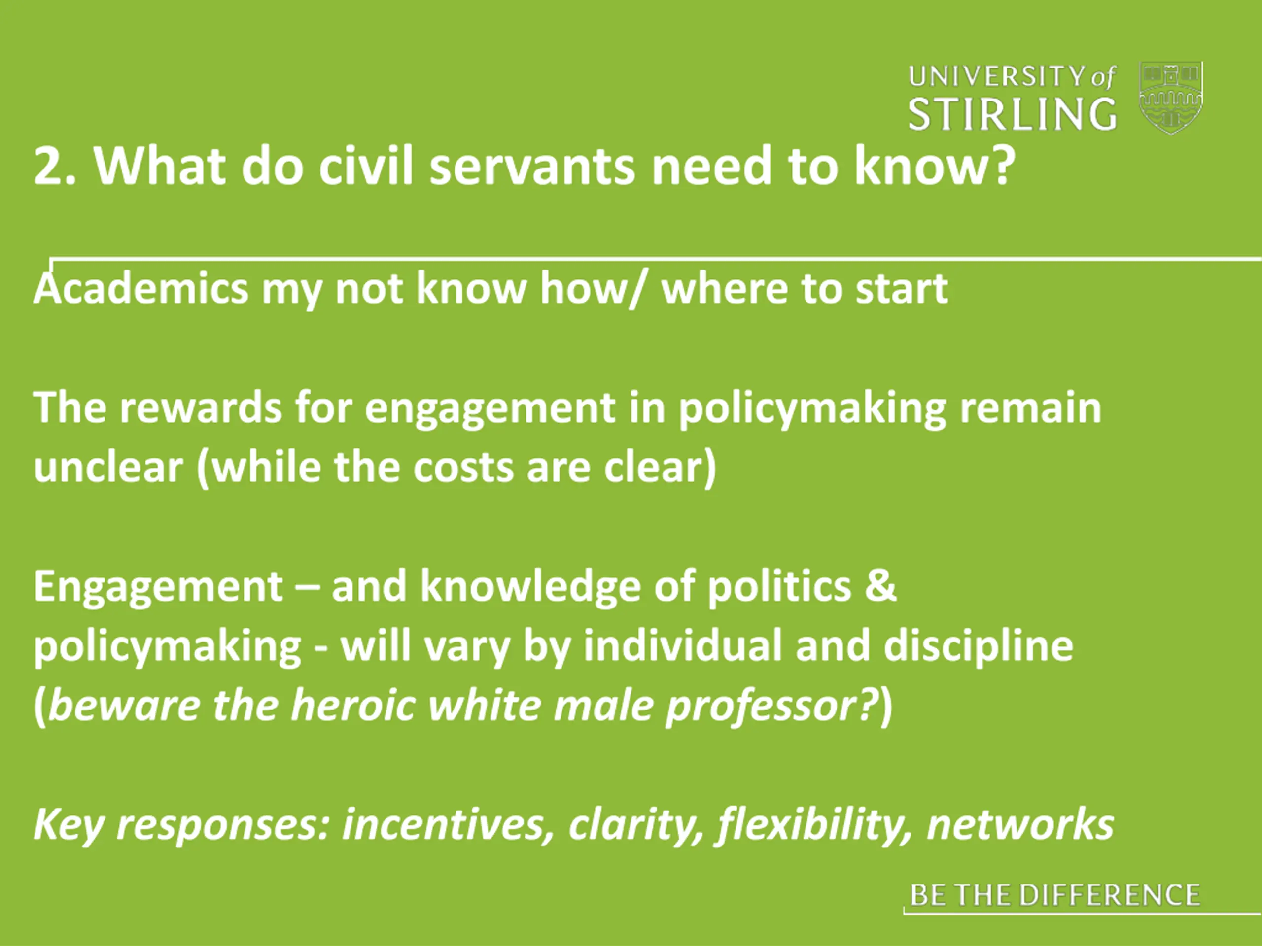 2. What do civil servants need to know? Academics my not know how/ where to start The rewards for engagement in policymaking remain unclear (while the costs are clear) Engagement and knowledge of politics & policymaking - will vary by individual and discipline (beware the heroic white male professor?) Key responses: incentives, clarity, flexibility, networks