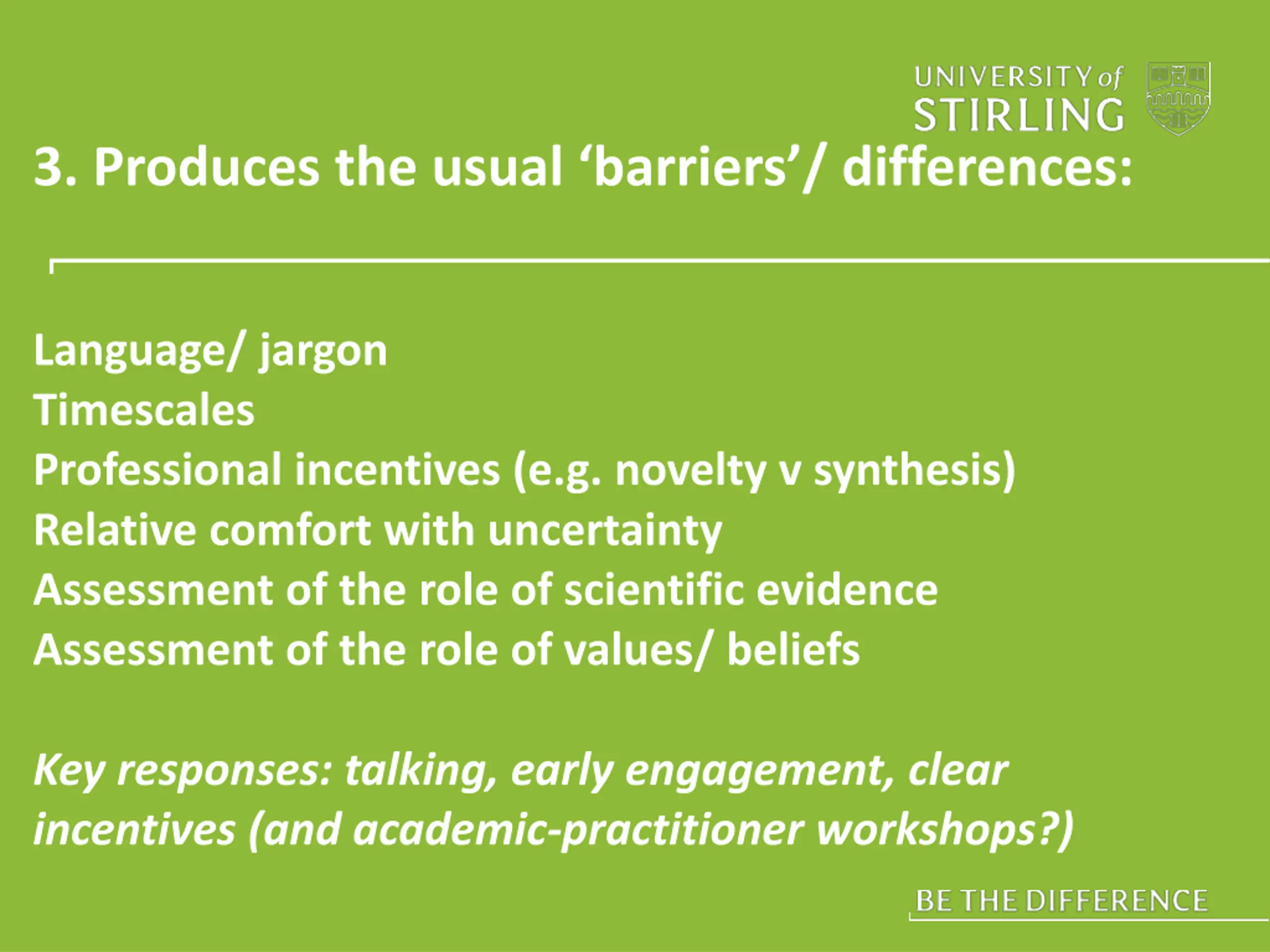 3. Produces the usual barriers/ differences: Language/ jargon Timescales Professional incentives (e.g. novelty v synthesis) Relative comfort with uncertainty Assessment of the role of scientific evidence Assessment of the role of values/ beliefs Key responses: talking, early engagement, clear incentives (and academic-practitioner workshops?)