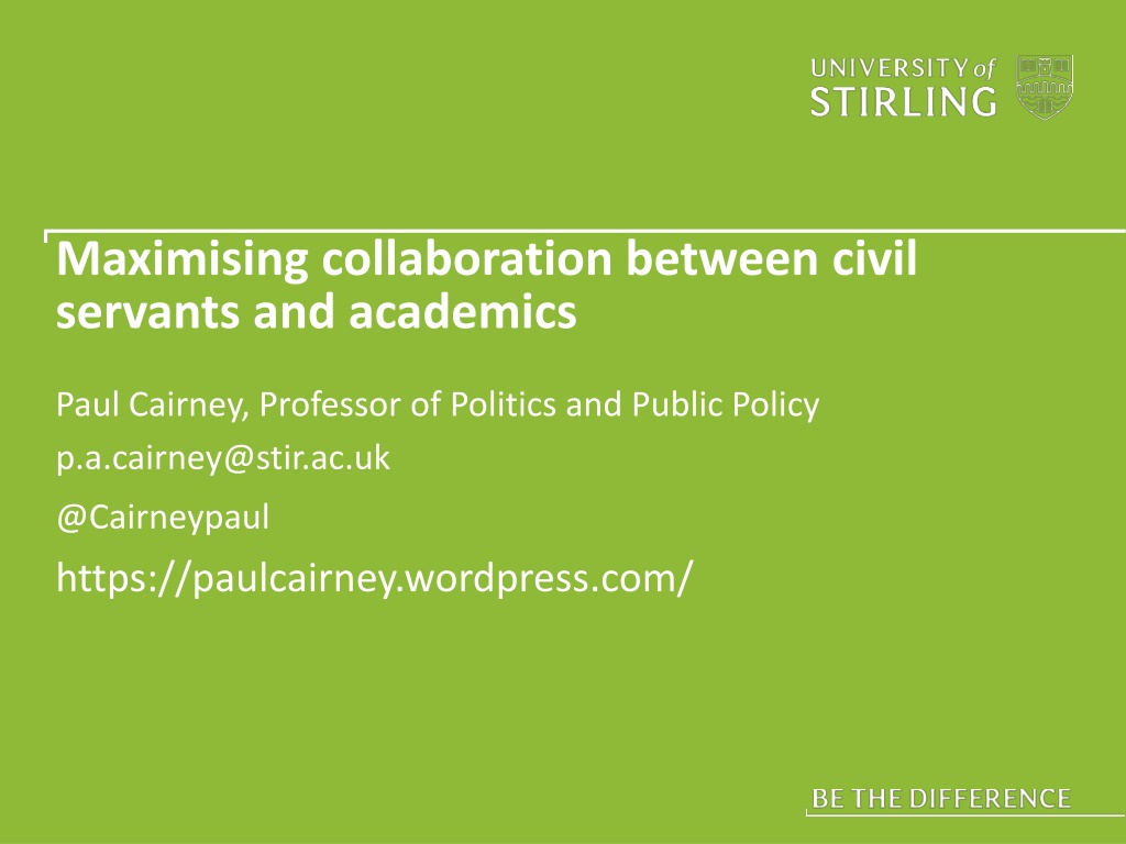 Maximising collaboration between civil servants and academics Paul Cairney, Professor of Politics and Public Policy p.a.cairney@stir.ac.uk @Cairneypaul https://paulcairney.wordpress.com/