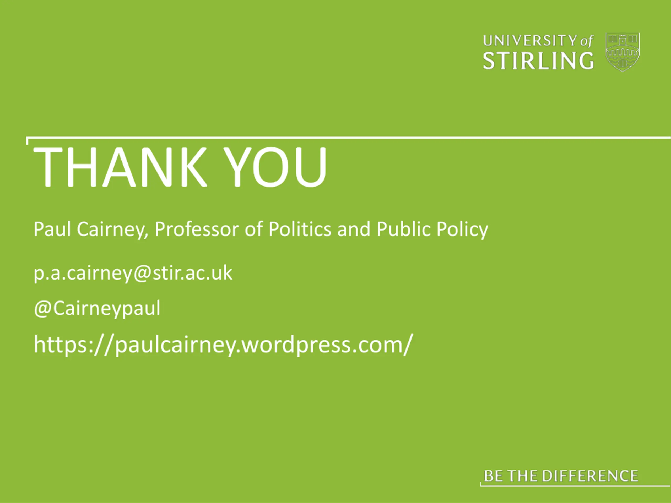 THANK YOU Paul Cairney, Professor of Politics and Public Policy p.a.cairney@stir.ac.uk @Cairneypaul https://paulcairney.wordpress.com/