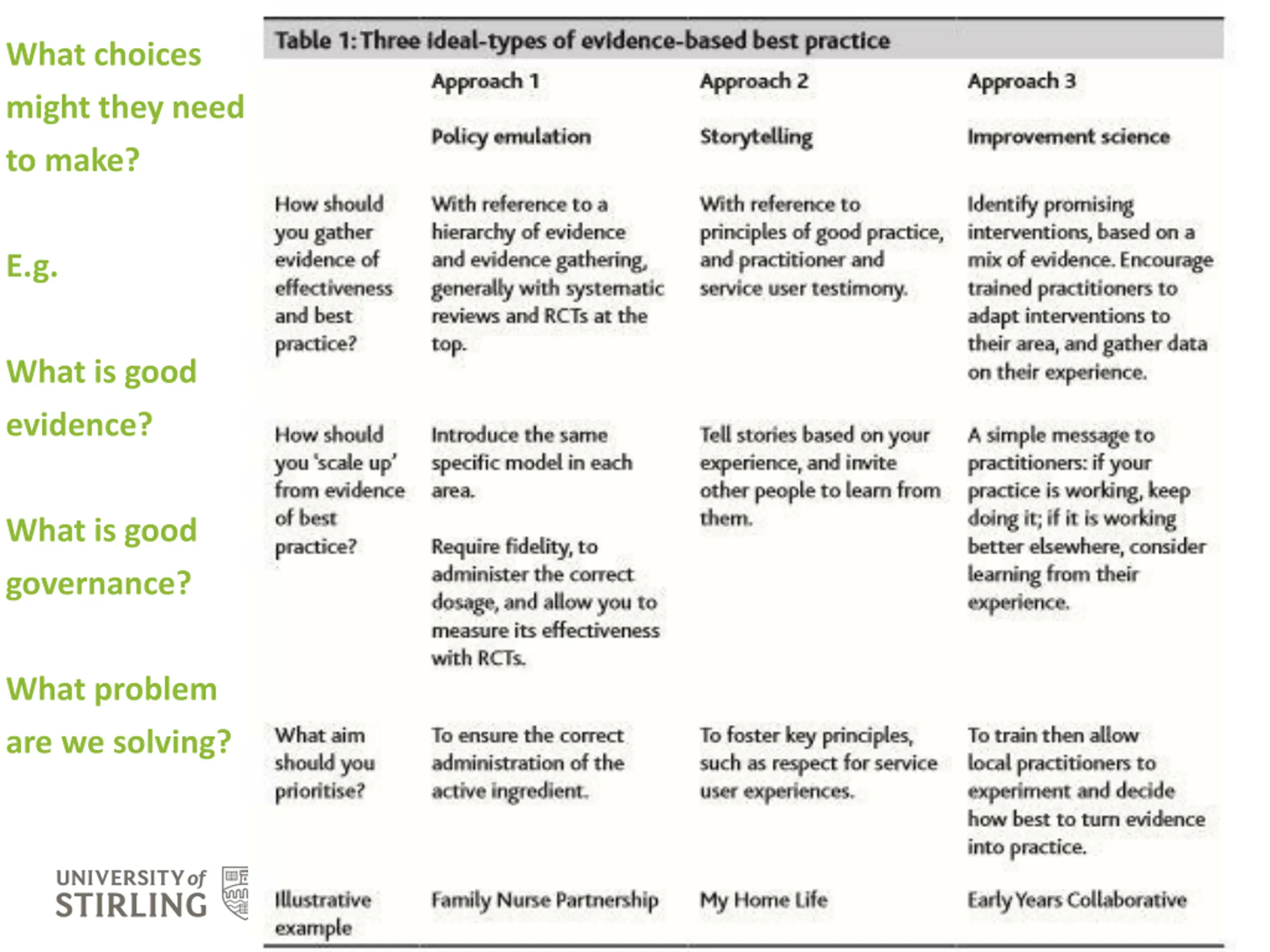What choices might they need to make? E.g. What is good evidence? What is good governance? What problem are we solving?