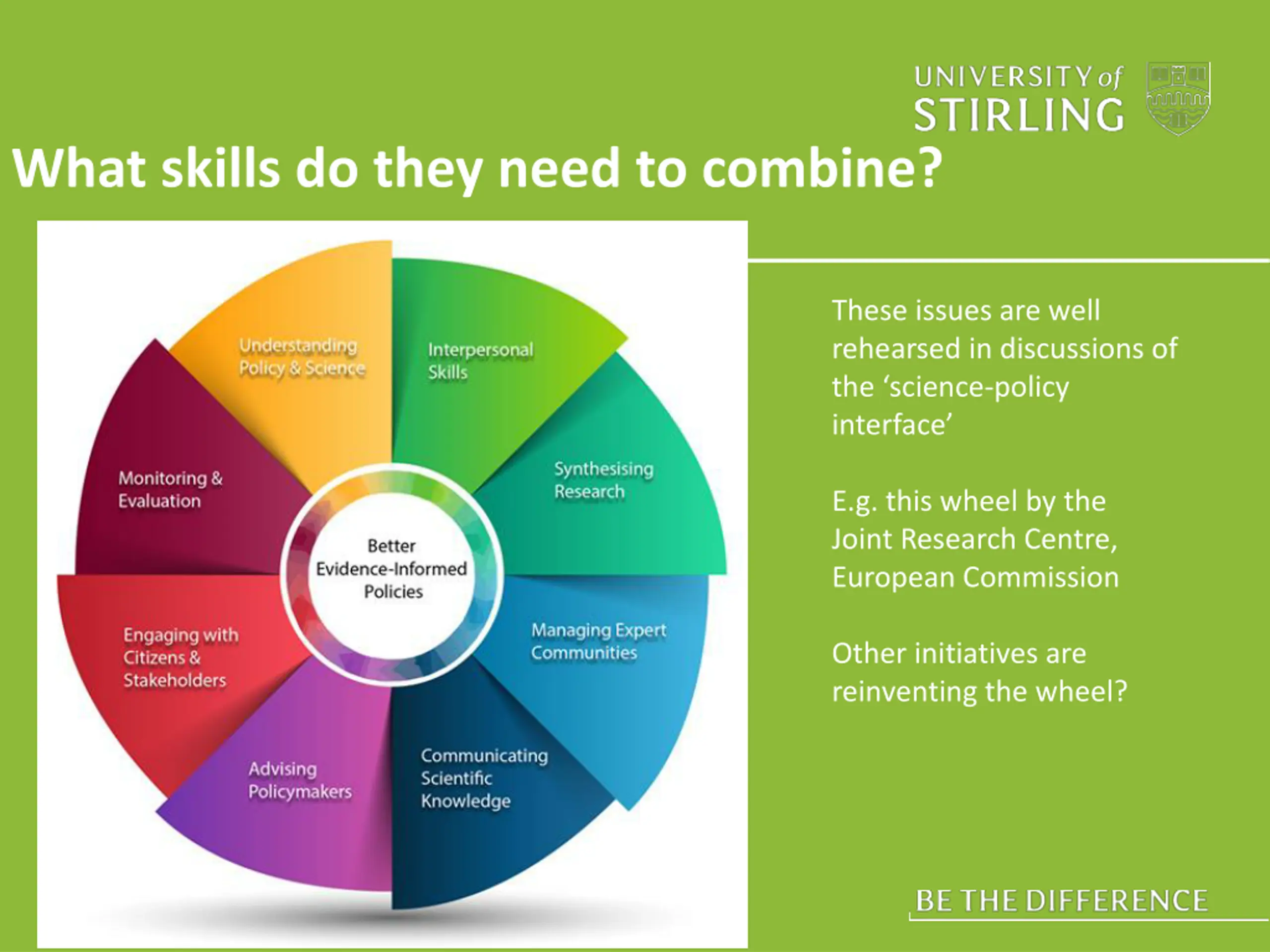 What skills do they need to combine? These issues are well rehearsed in discussions of the science-policy interface E.g. this wheel by the Joint Research Centre, European Commission Other initiatives are reinventing the wheel?