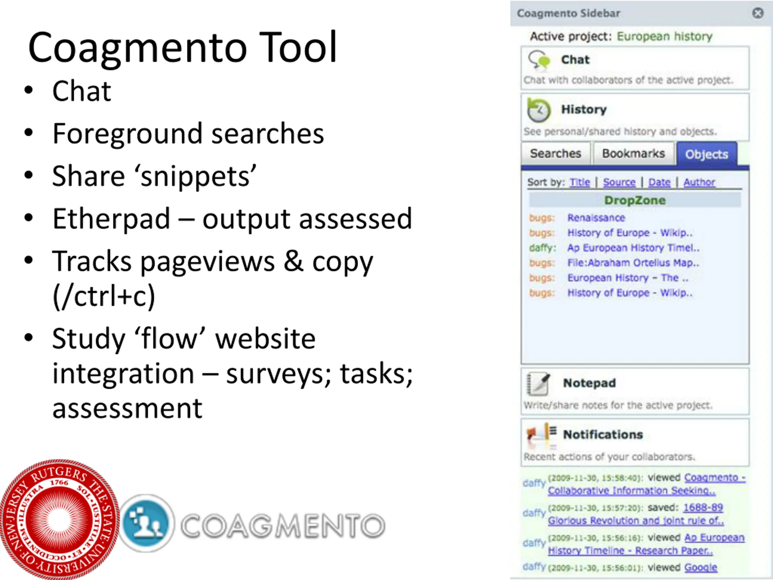 Coagmento Tool Chat Foreground searches Share snippets Etherpad output assessed Tracks pageviews & copy (/ctrl+c) Study flow website integration surveys; tasks; assessment