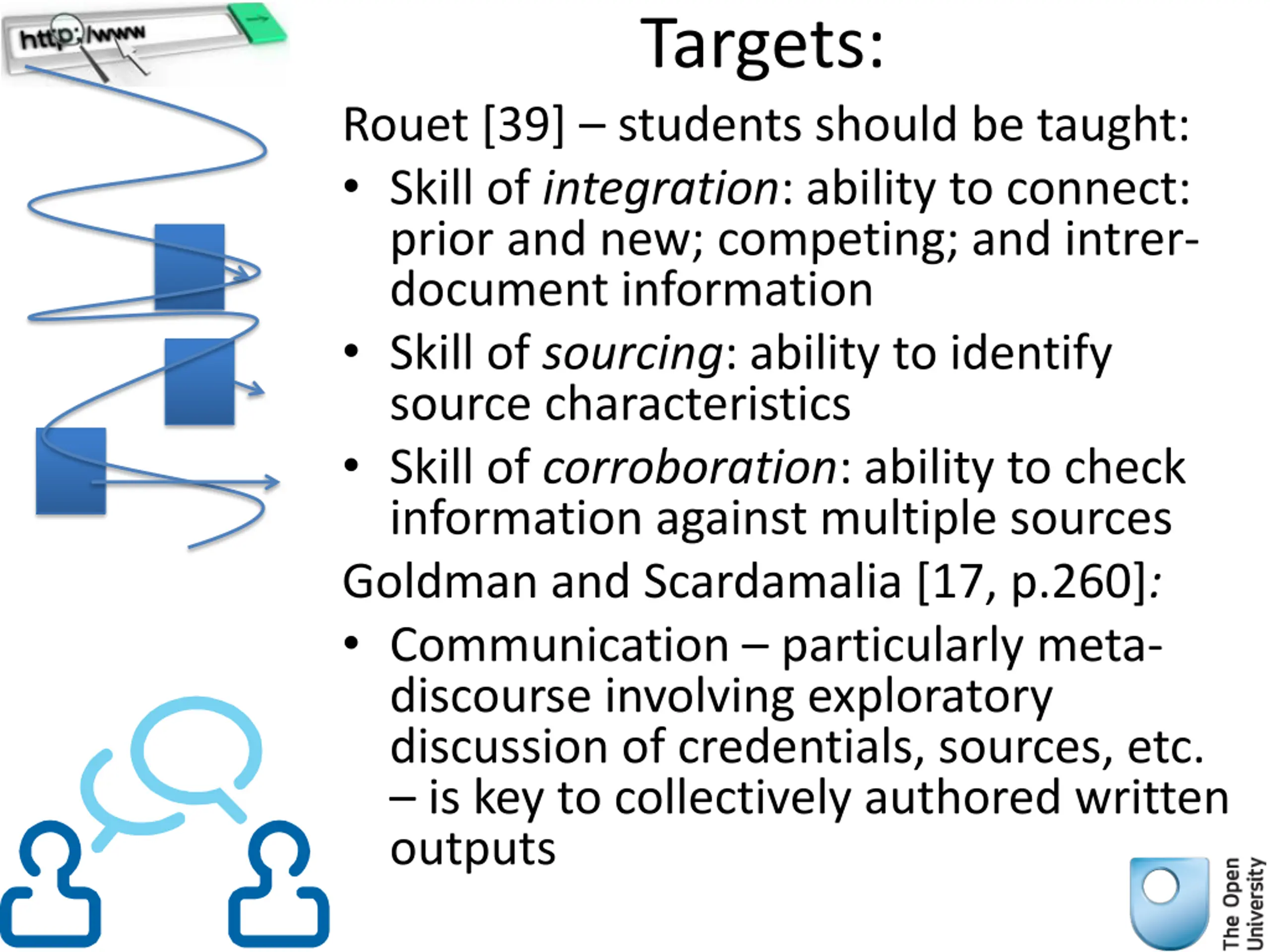 Targets: Rouet [39] students should be taught: Skill of integration: ability to connect: prior and new; competing; and intrer- document information Skill of sourcing: ability to identify source characteristics Skill of corroboration: ability to check information against multiple sources Goldman and Scardamalia [17, p.260]: Communication particularly meta- discourse involving exploratory discussion of credentials, sources, etc. is key to collectively authored written outputs