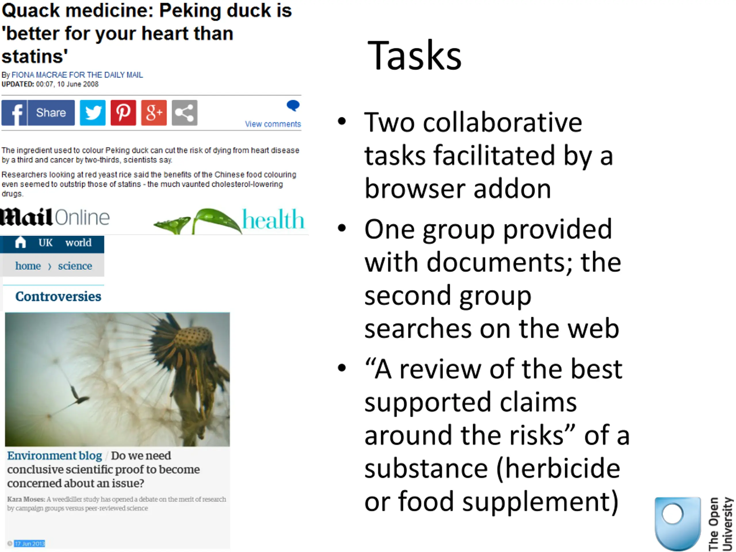 Tasks Two collaborative tasks facilitated by a browser addon One group provided with documents; the second group searches on the web A review of the best supported claims around the risks of a substance (herbicide or food supplement)