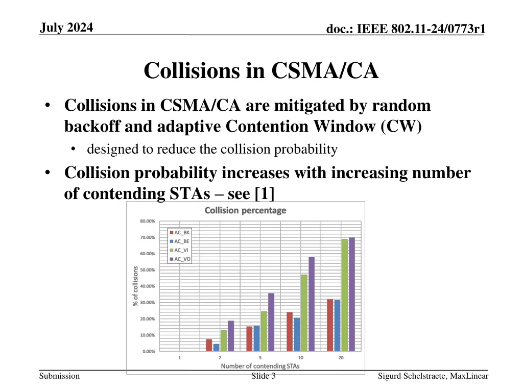 July 2024 doc.: IEEE 802.11-24/0773r1 Collisions in CSMA/CA Collisions in CSMA/CA are mitigated by random backoff and adaptive Contention Window (CW) designed to reduce the collision probability Collision probability increases with increasing number of contending STAs see [1] Submission Slide 3 Sigurd Schelstraete, MaxLinear