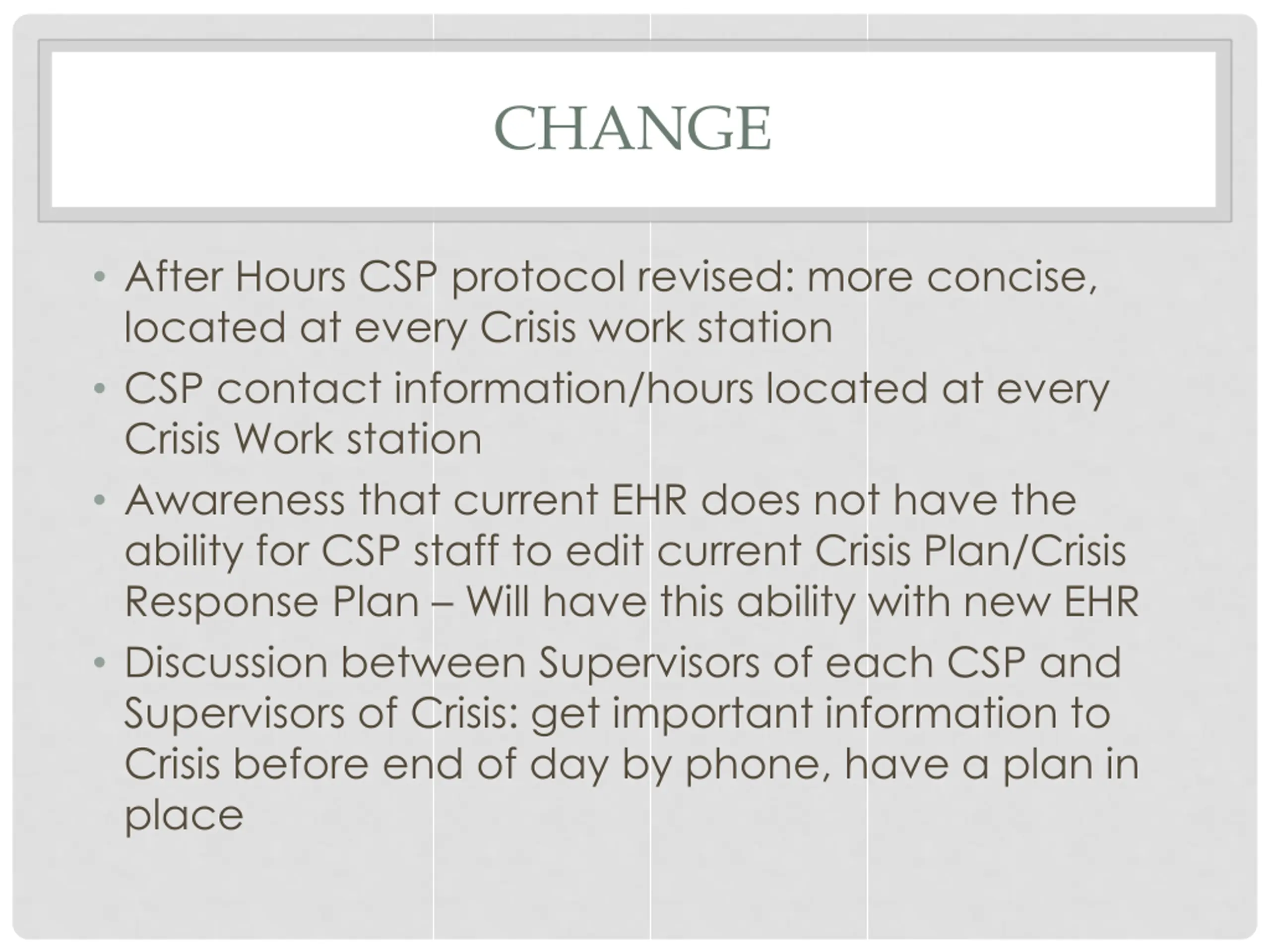 CHANGE After Hours CSP protocol revised: more concise, located at every Crisis work station CSP contact information/hours located at every Crisis Work station Awareness that current EHR does not have the ability for CSP staff to edit current Crisis Plan/Crisis Response Plan Will have this ability with new EHR Discussion between Supervisors of each CSP and Supervisors of Crisis: get important information to Crisis before end of day by phone, have a plan in place