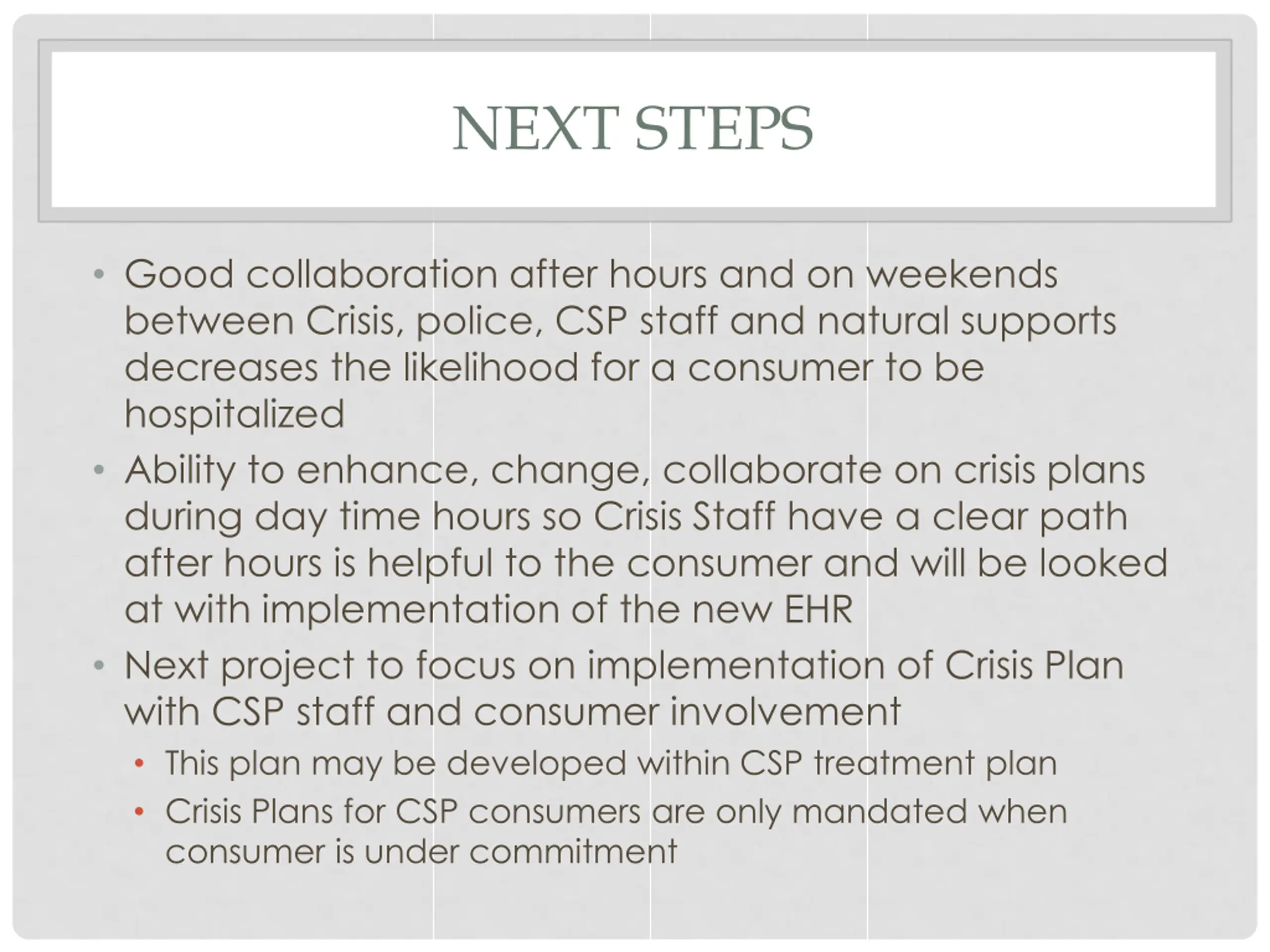 NEXT STEPS Good collaboration after hours and on weekends between Crisis, police, CSP staff and natural supports decreases the likelihood for a consumer to be hospitalized Ability to enhance, change, collaborate on crisis plans during day time hours so Crisis Staff have a clear path after hours is helpful to the consumer and will be looked at with implementation of the new EHR Next project to focus on implementation of Crisis Plan with CSP staff and consumer involvement This plan may be developed within CSP treatment plan Crisis Plans for CSP consumers are only mandated when consumer is under commitment