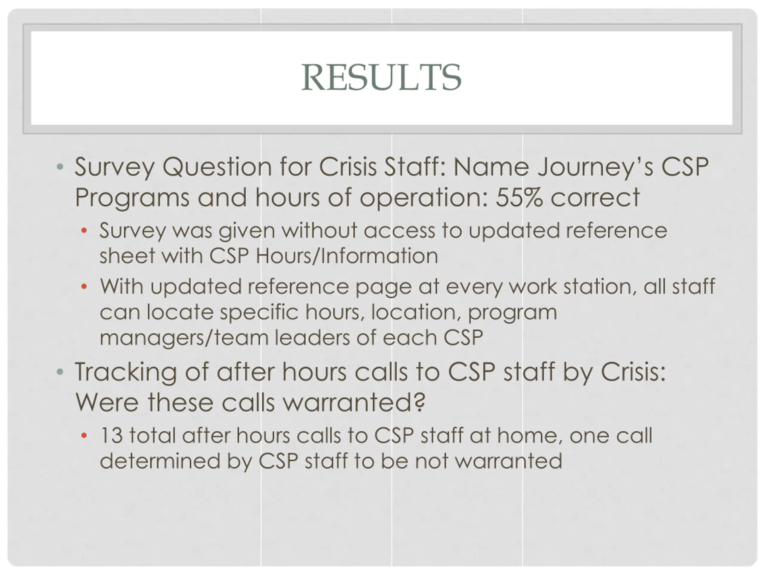 RESULTS Survey Question for Crisis Staff: Name Journey s CSP Programs and hours of operation: 55% correct Survey was given without access to updated reference sheet with CSP Hours/Information With updated reference page at every work station, all staff can locate specific hours, location, program managers/team leaders of each CSP Tracking of after hours calls to CSP staff by Crisis: Were these calls warranted? 13 total after hours calls to CSP staff at home, one call determined by CSP staff to be not warranted