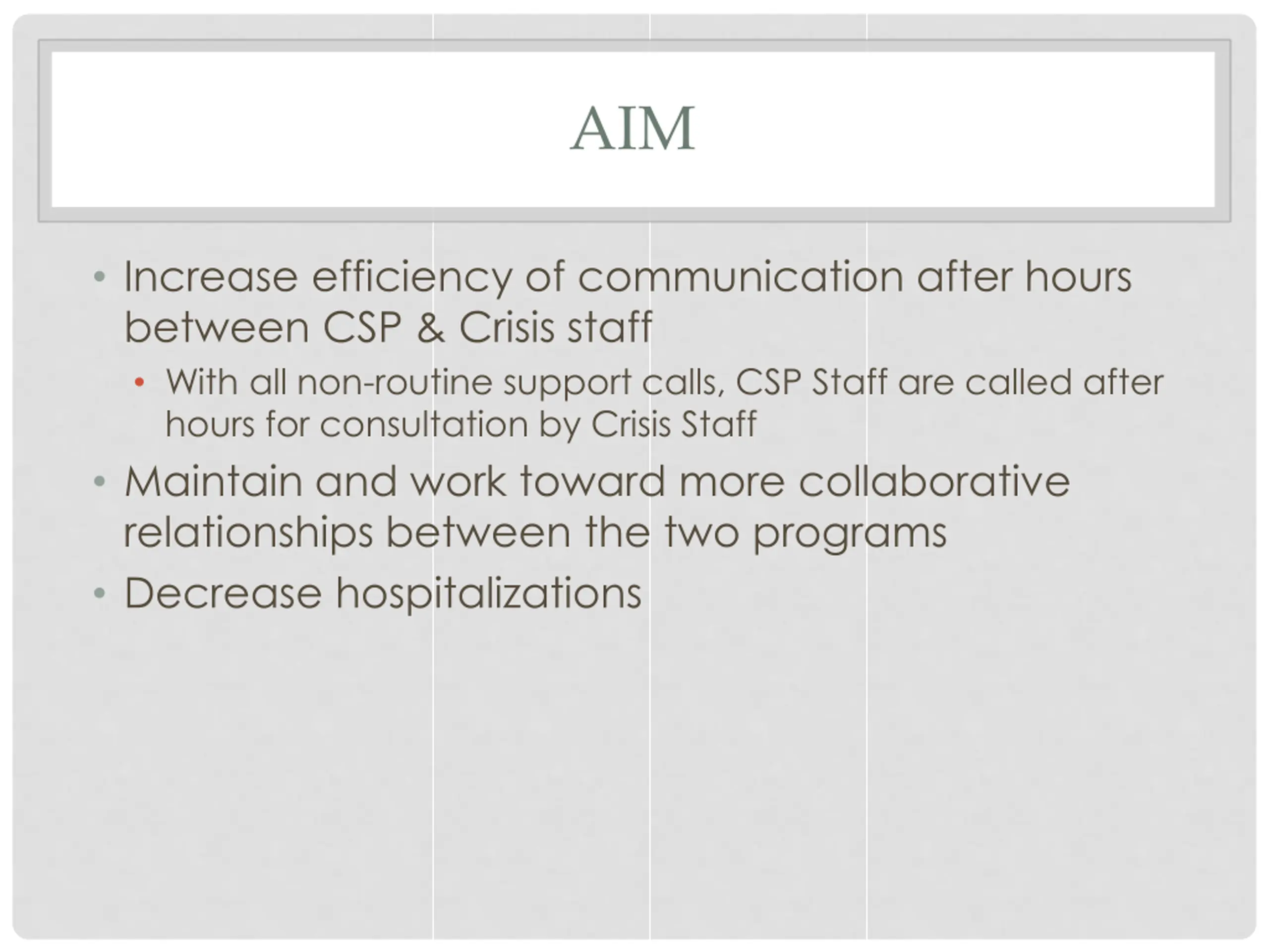 AIM Increase efficiency of communication after hours between CSP & Crisis staff With all non-routine support calls, CSP Staff are called after hours for consultation by Crisis Staff Maintain and work toward more collaborative relationships between the two programs Decrease hospitalizations